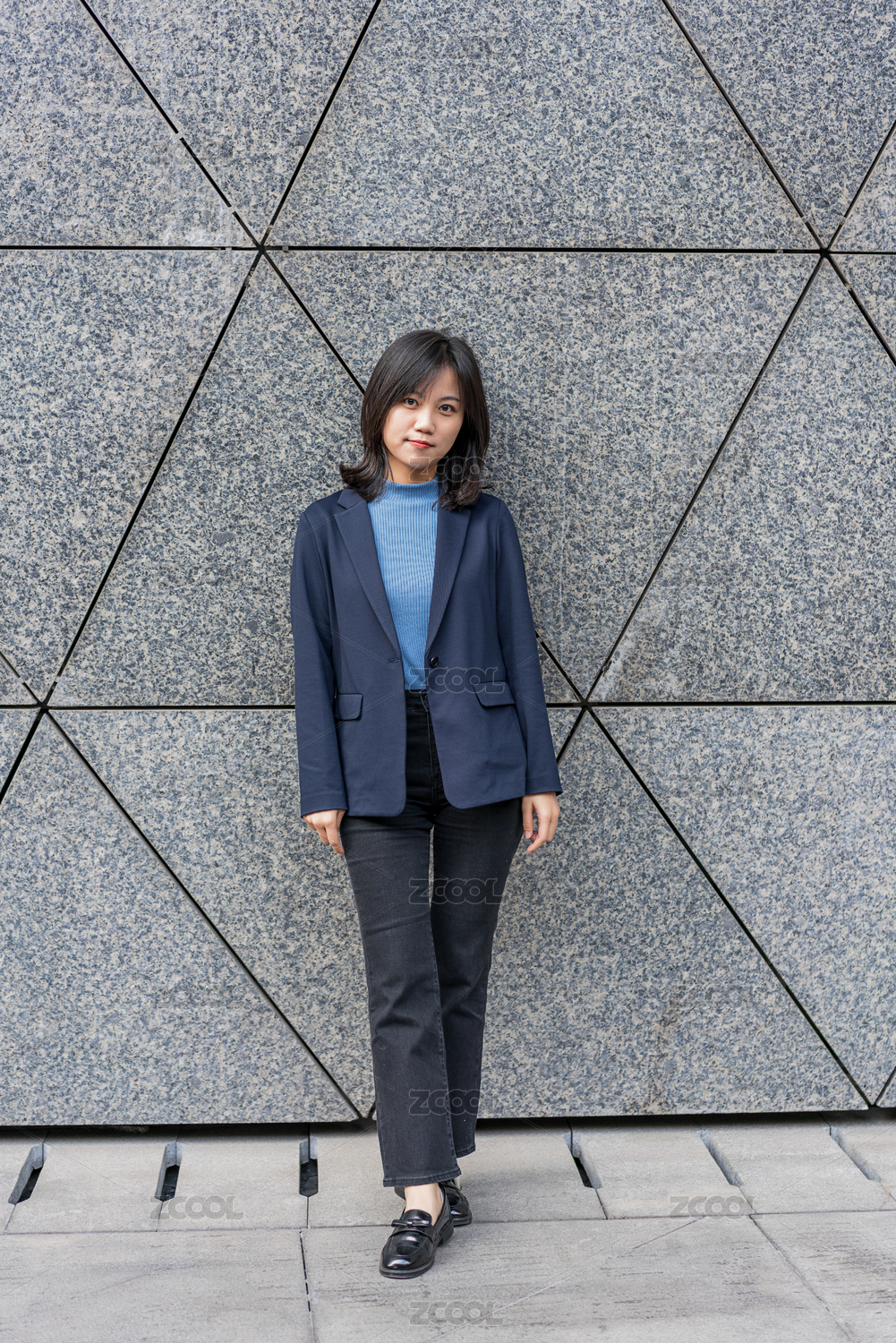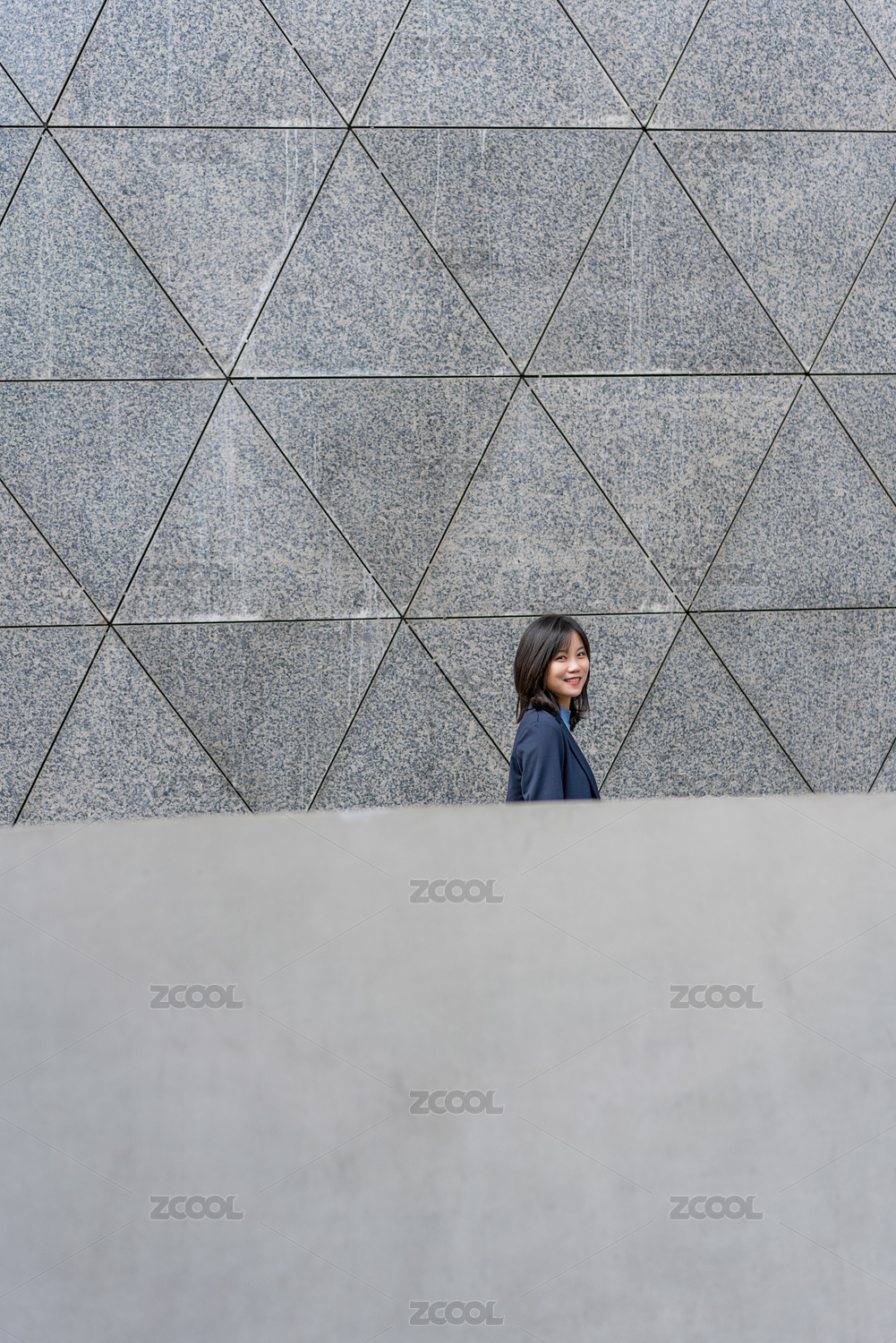 灰色墙壁前面年轻的商务女性面向镜头微笑