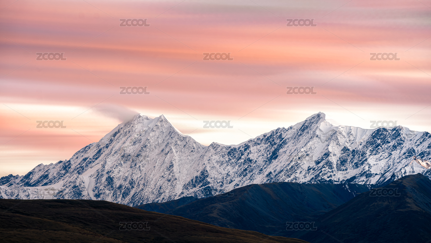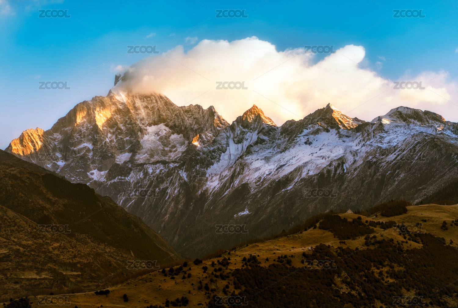 雪山山谷的晚霞