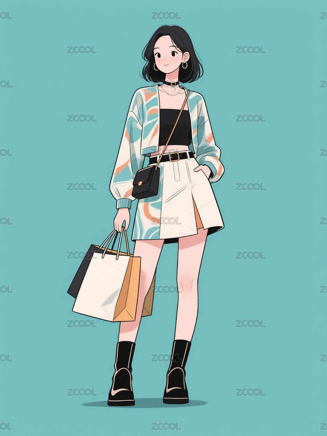 外套,风衣,长袖,过膝,长衣,女人,长发,手持,购物袋,手机