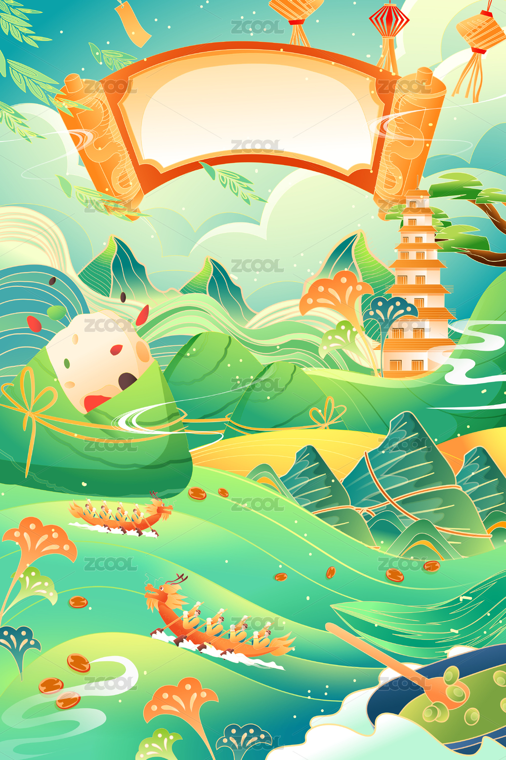 端午节赛龙舟传统节日建筑美食古风国潮插画