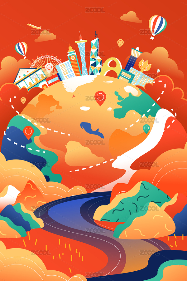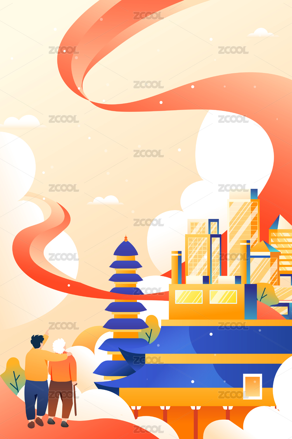 国庆节一家人出门景点旅游地标建筑国潮插画