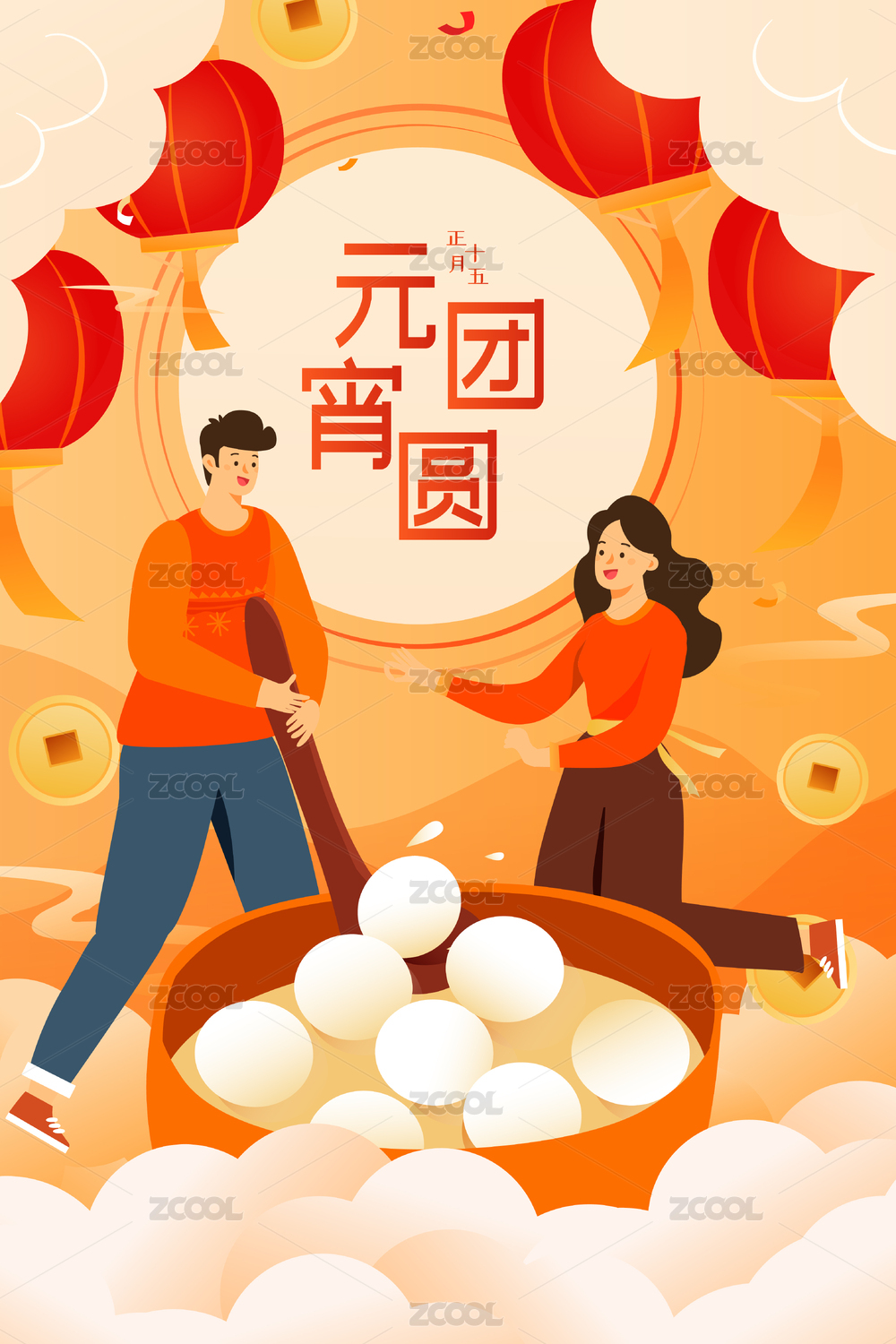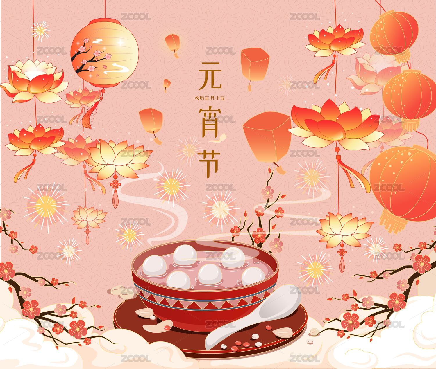 卡通闹元宵过节庆祝团圆活动中国风背景矢量插画