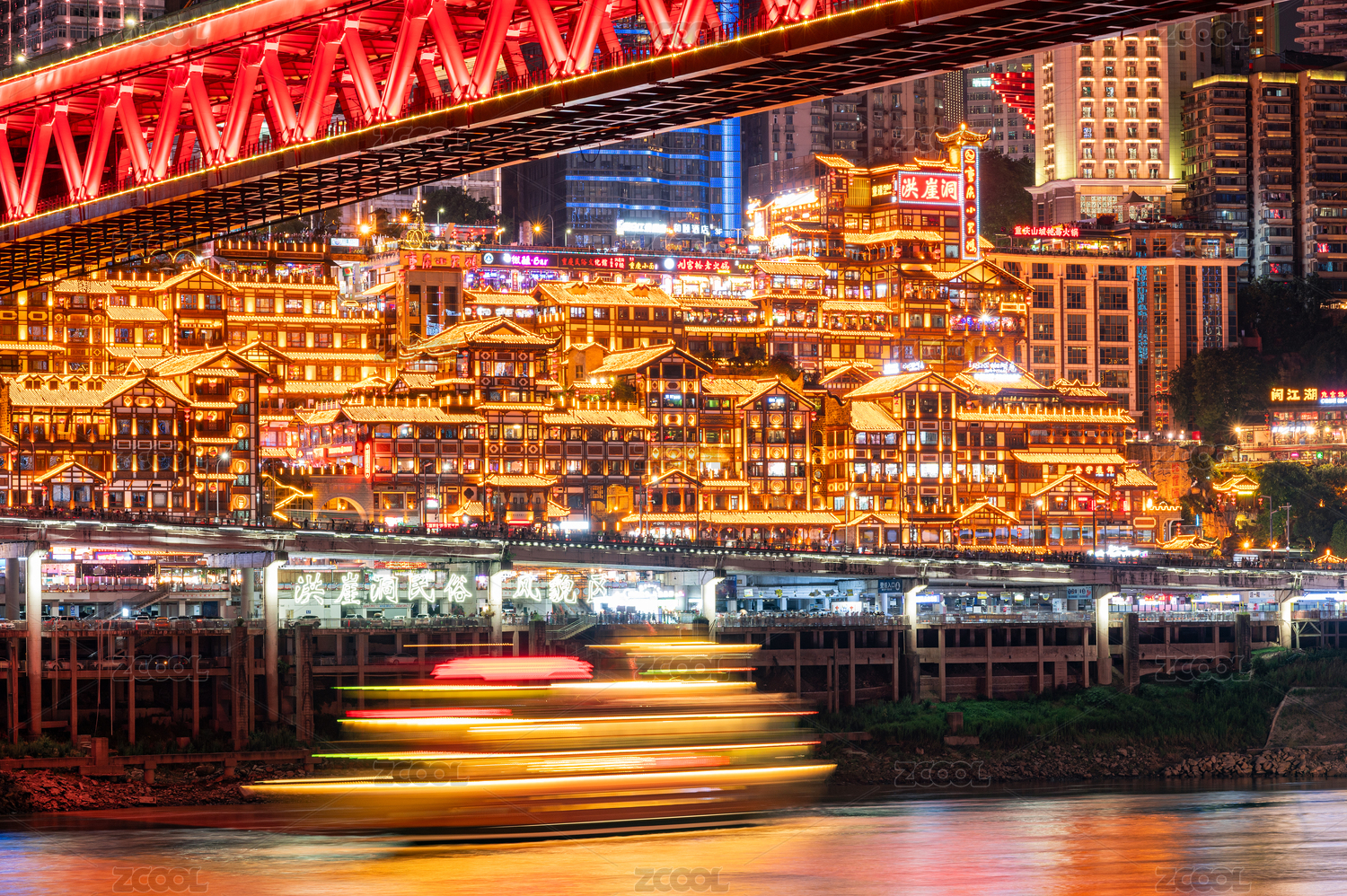 重庆洪崖洞和千厮门夜景风光和观光游轮