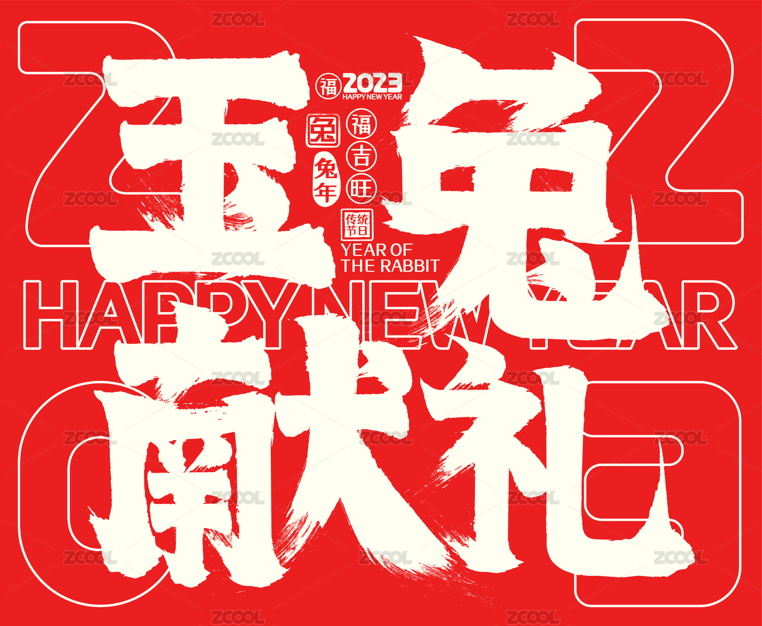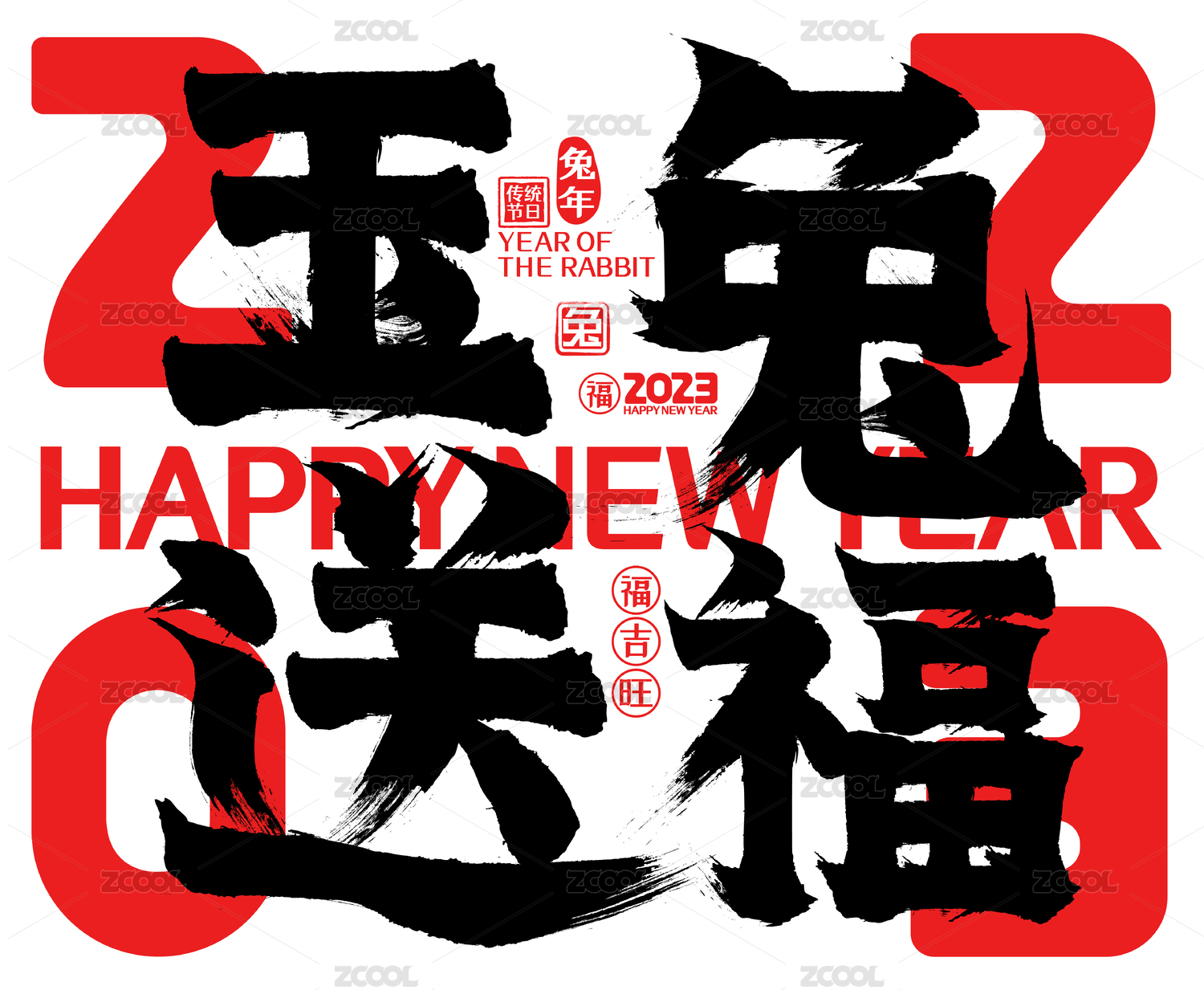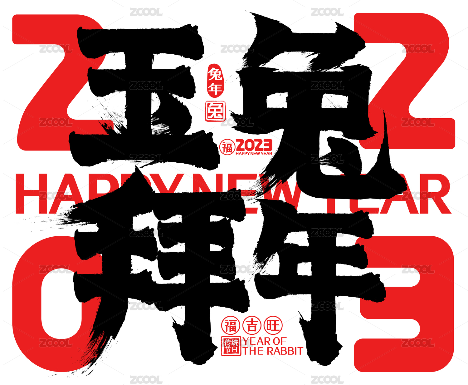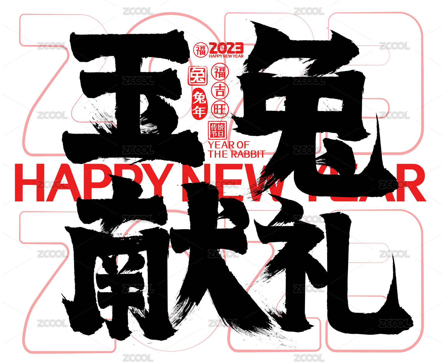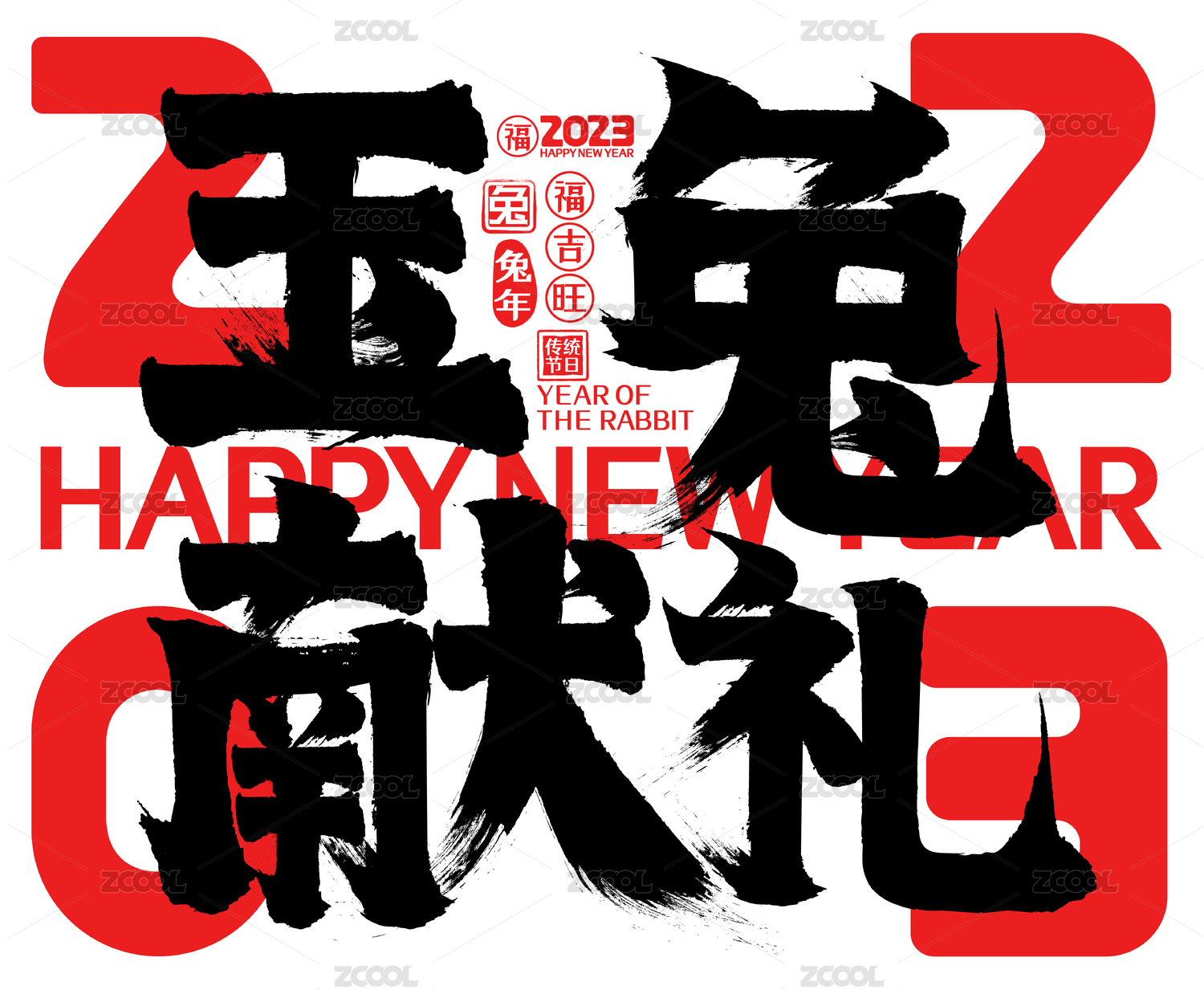 2023玉兔献礼喜庆中国红兔年春节毛笔字