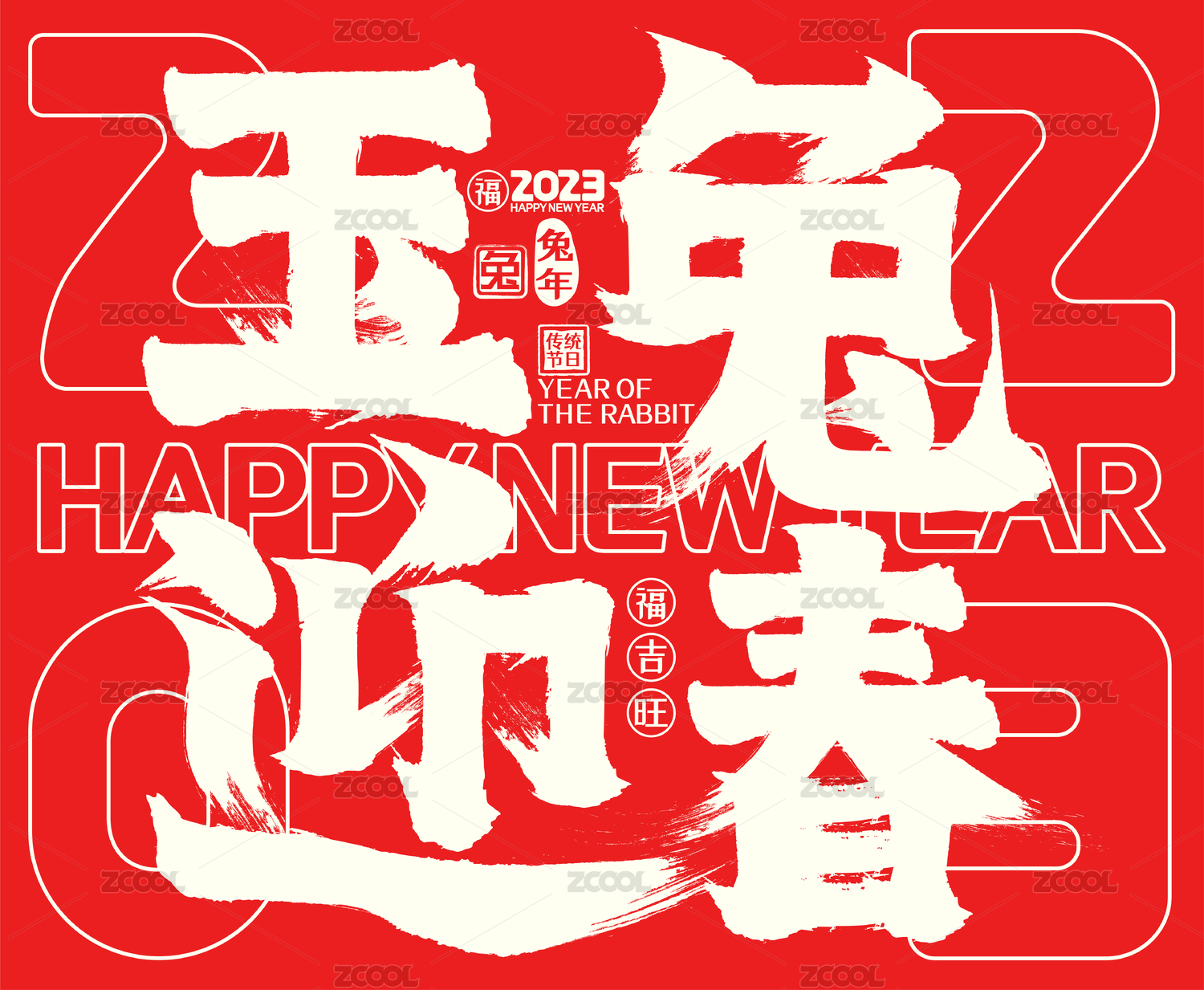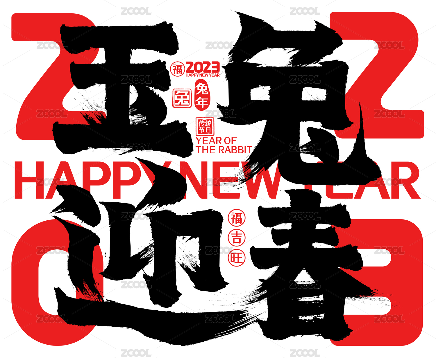 2023玉兔迎春喜庆中国红兔年春节毛笔字