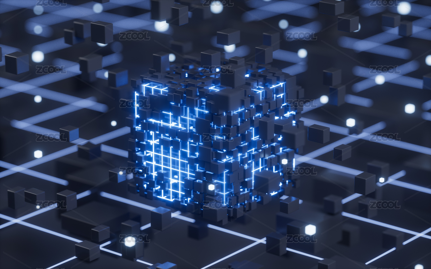 发光的立方体与聚集的核心,三维渲染