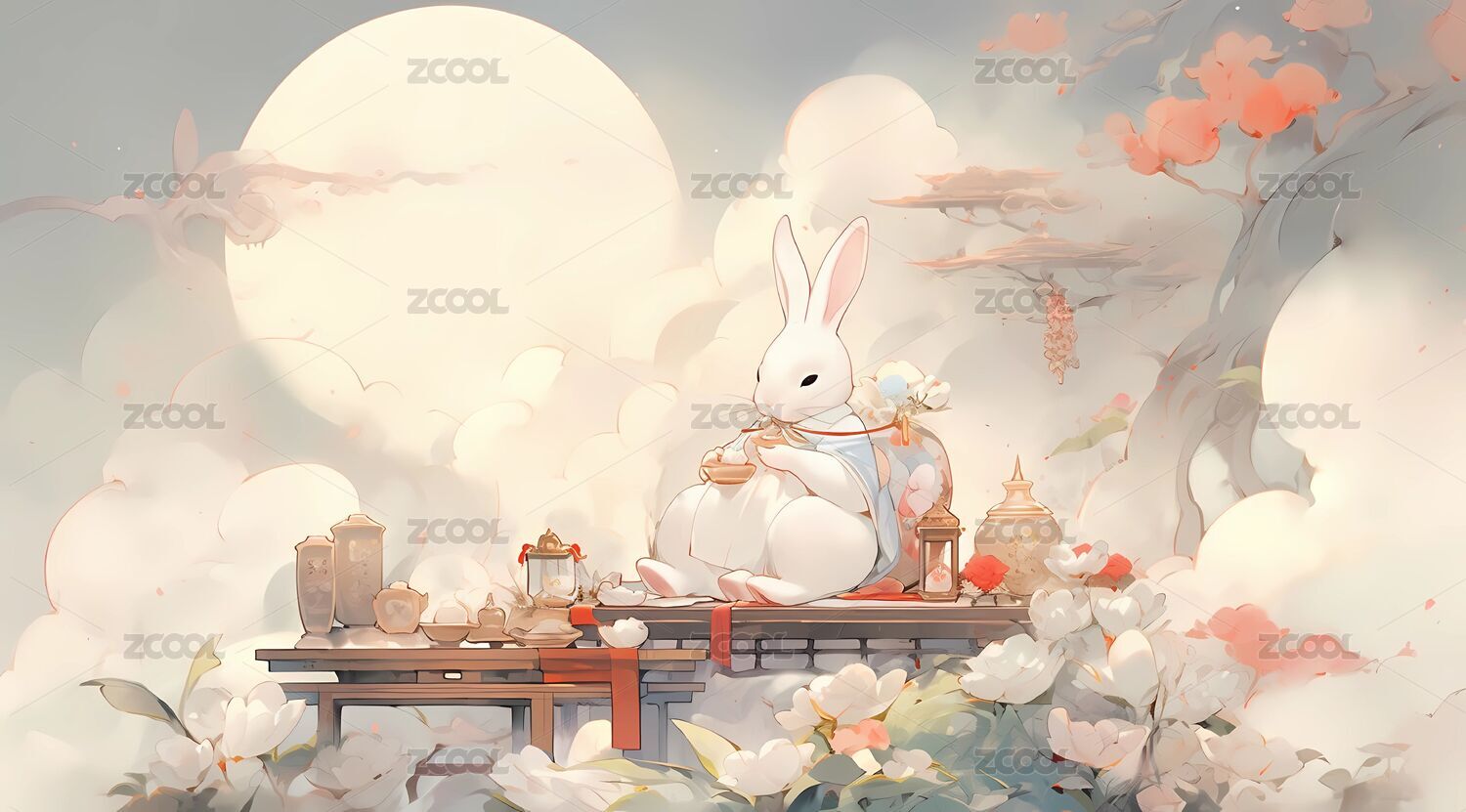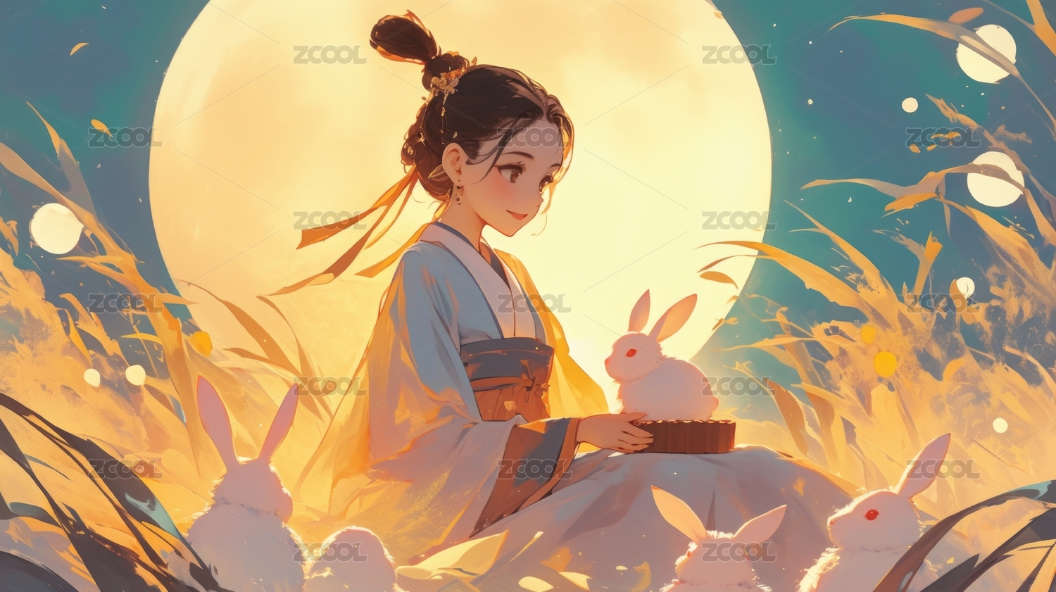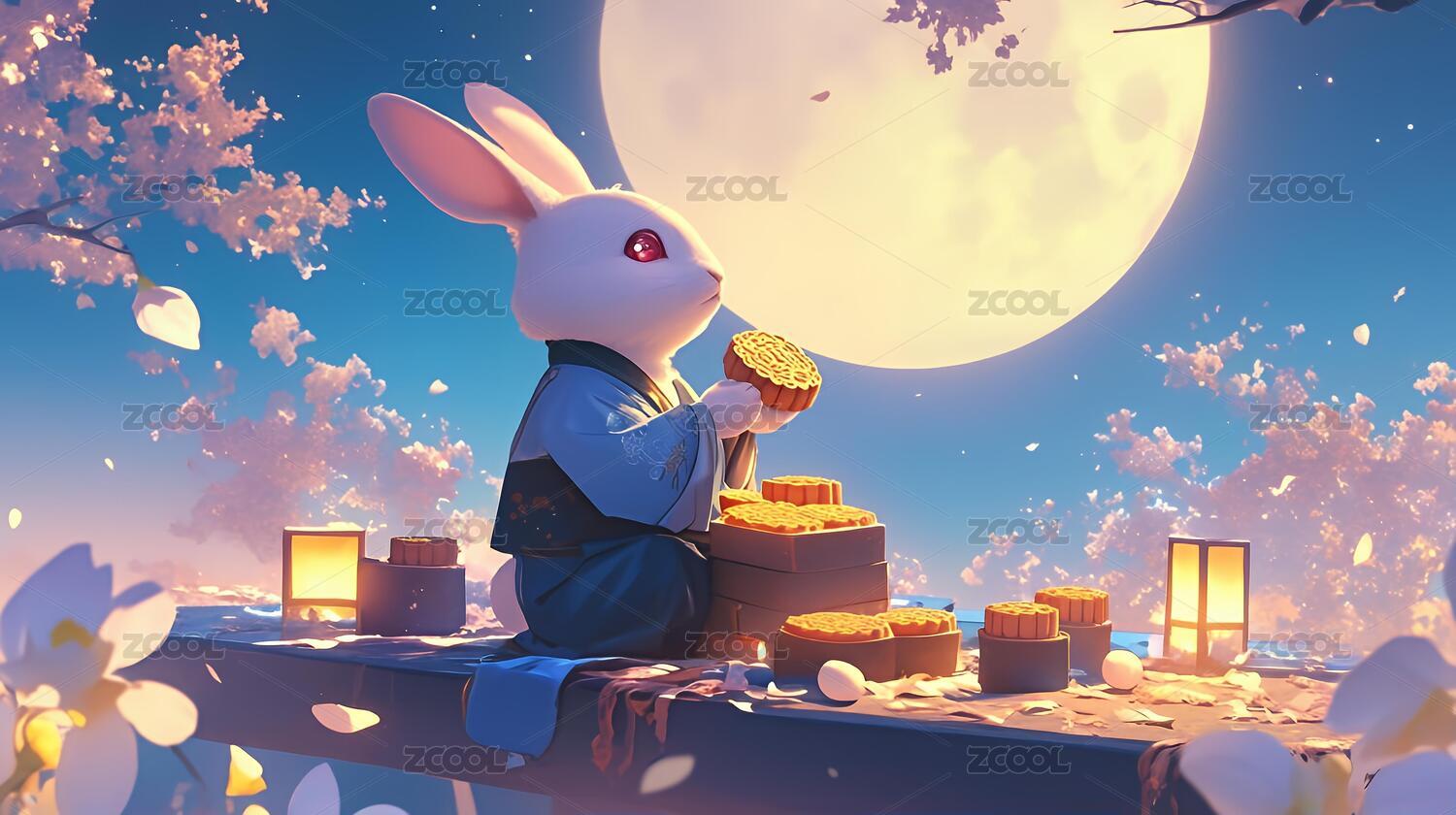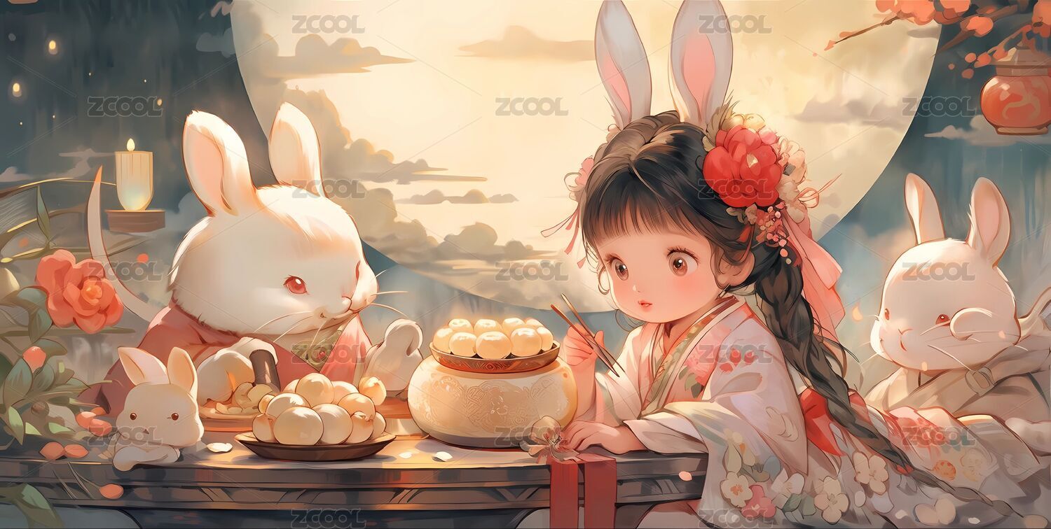嫦娥,玉兔,可爱,月饼,国风,节日,中秋,背景,壁纸,AIGC202403