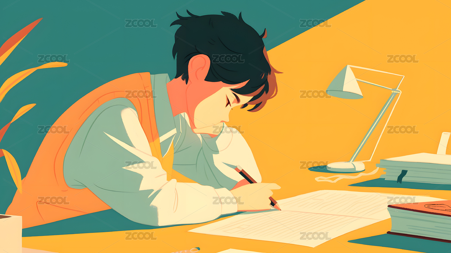白底一个坐在桌旁看书的男学生扁平卡通插画