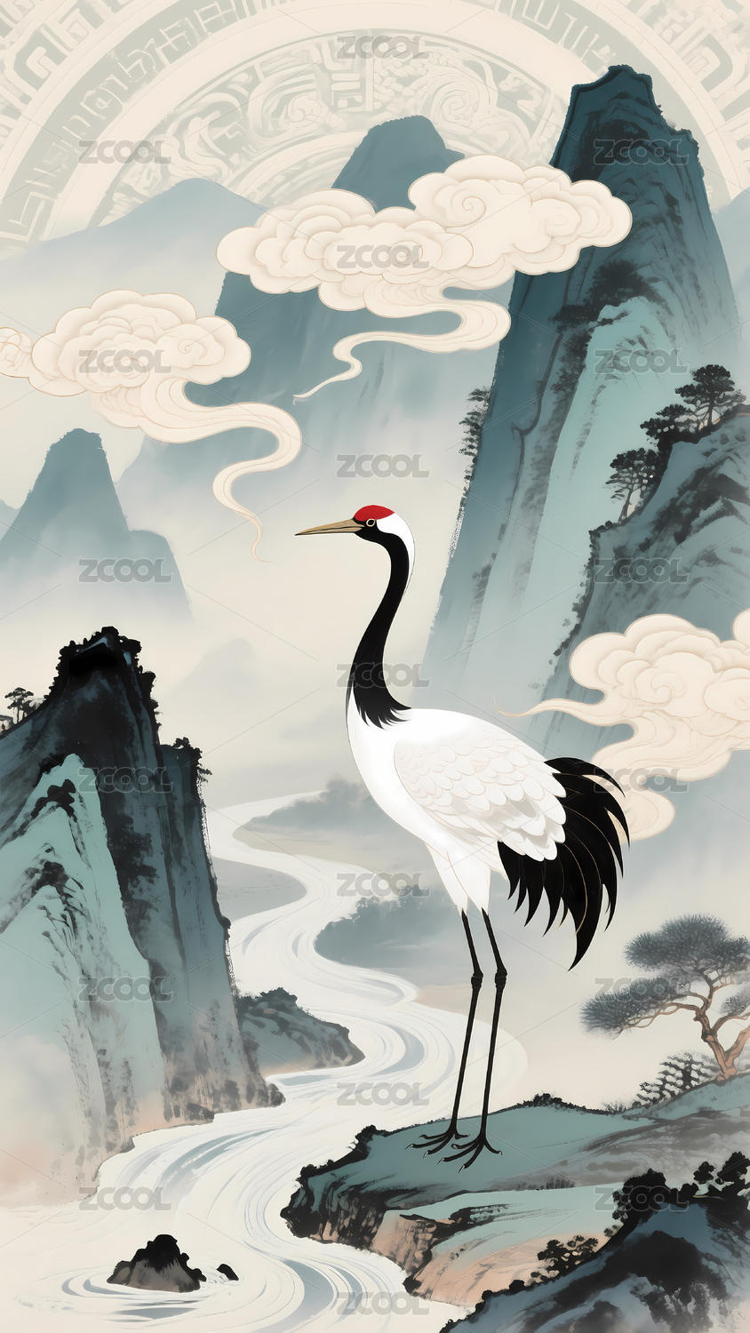 传统中式山水间的仙鹤