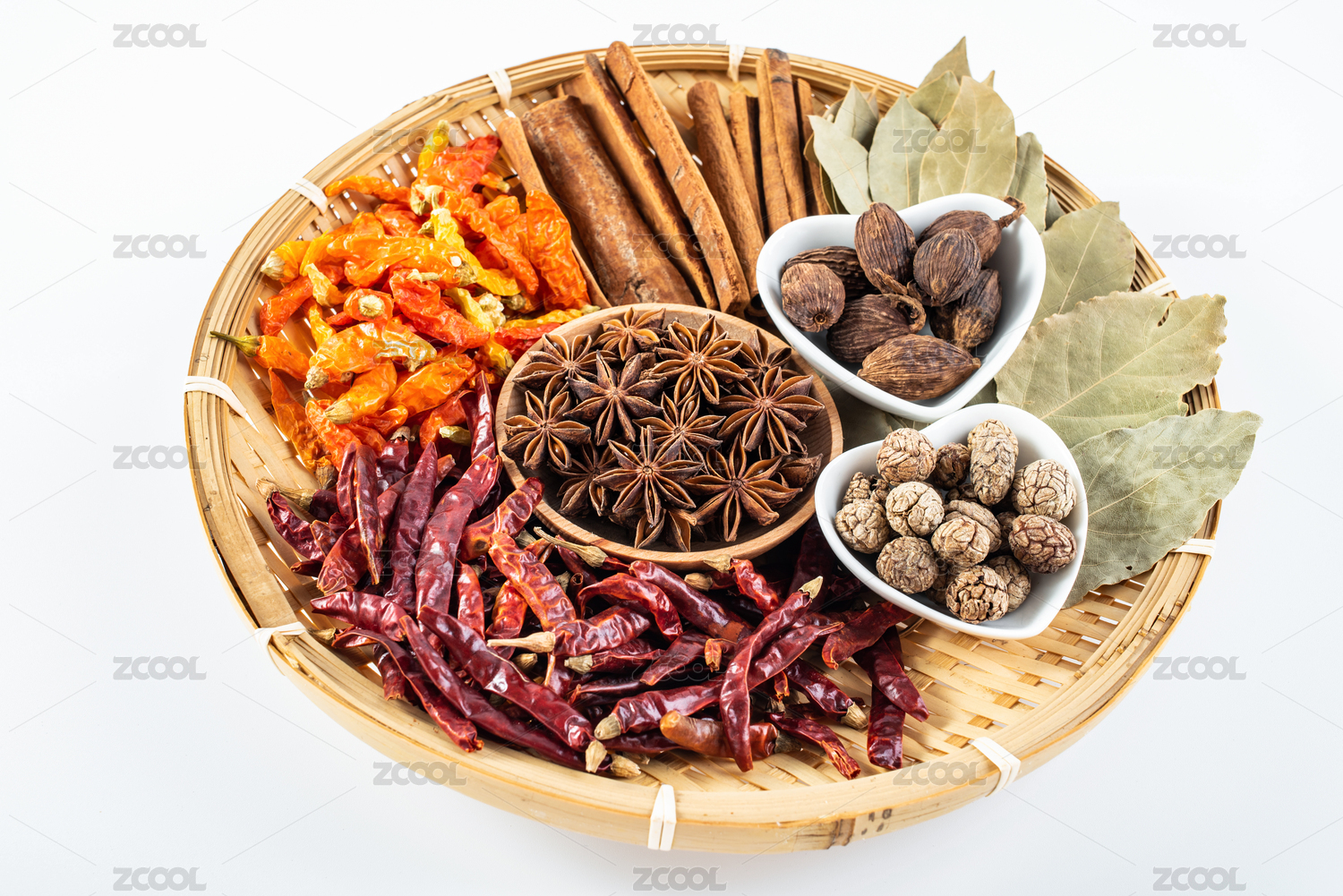 一盘中餐常用香辣烹饪调料香料在白背景上