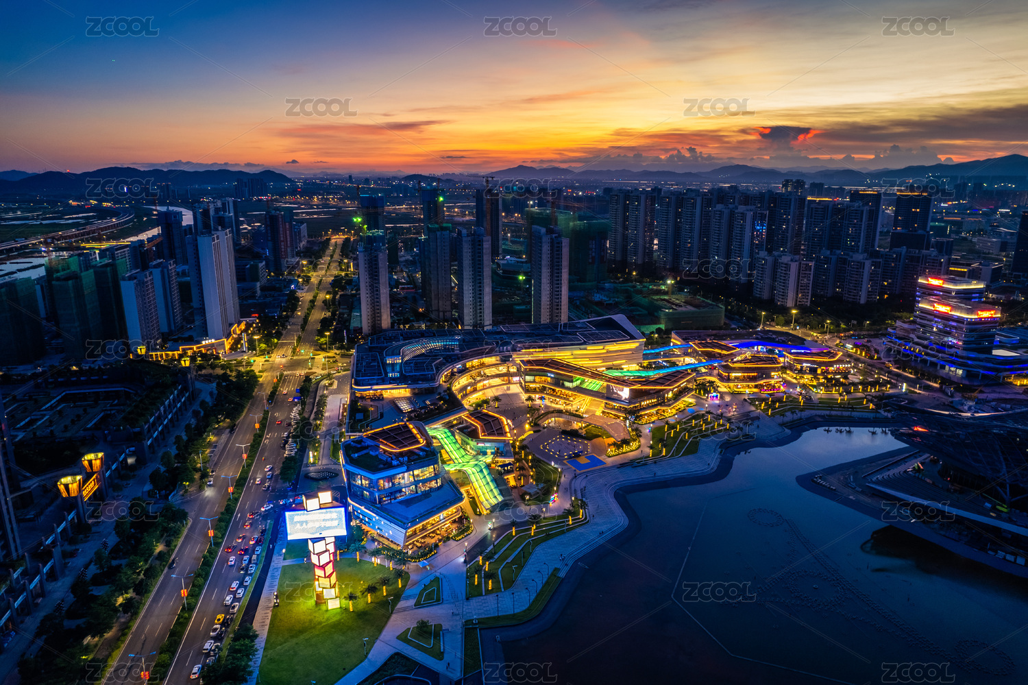 珠海市金湾区图书馆日落晚霞时分航拍
