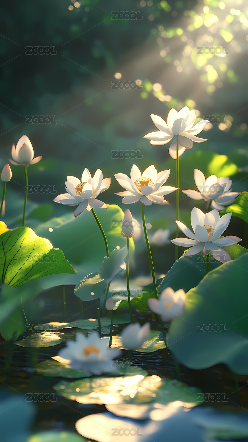 3d卡通夏天满荷叶荷花的池塘户外风景插画