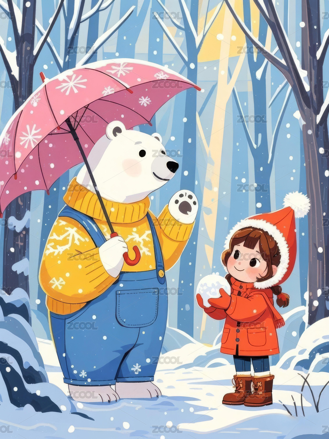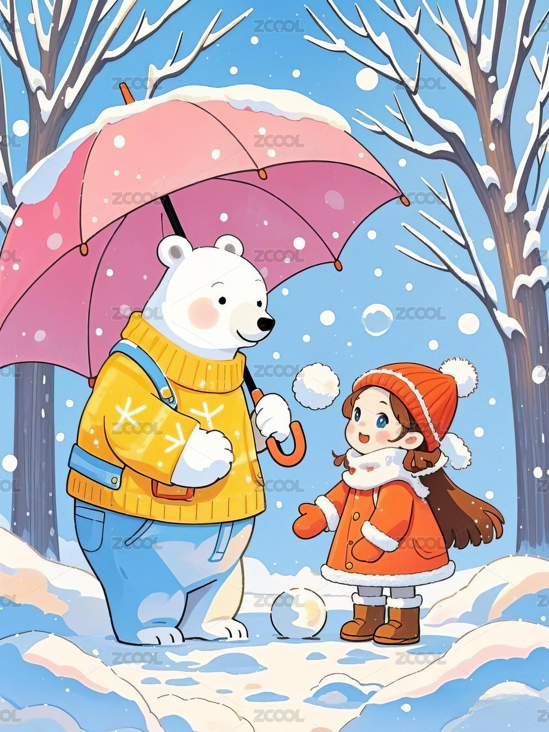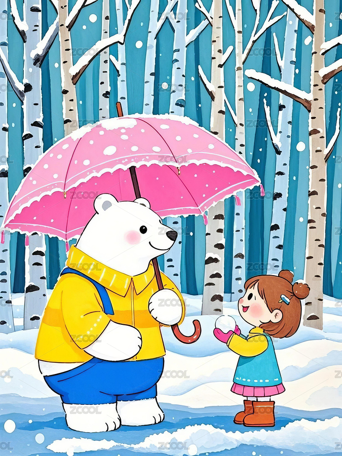 冬季里拿着雨伞的大白熊和小女孩