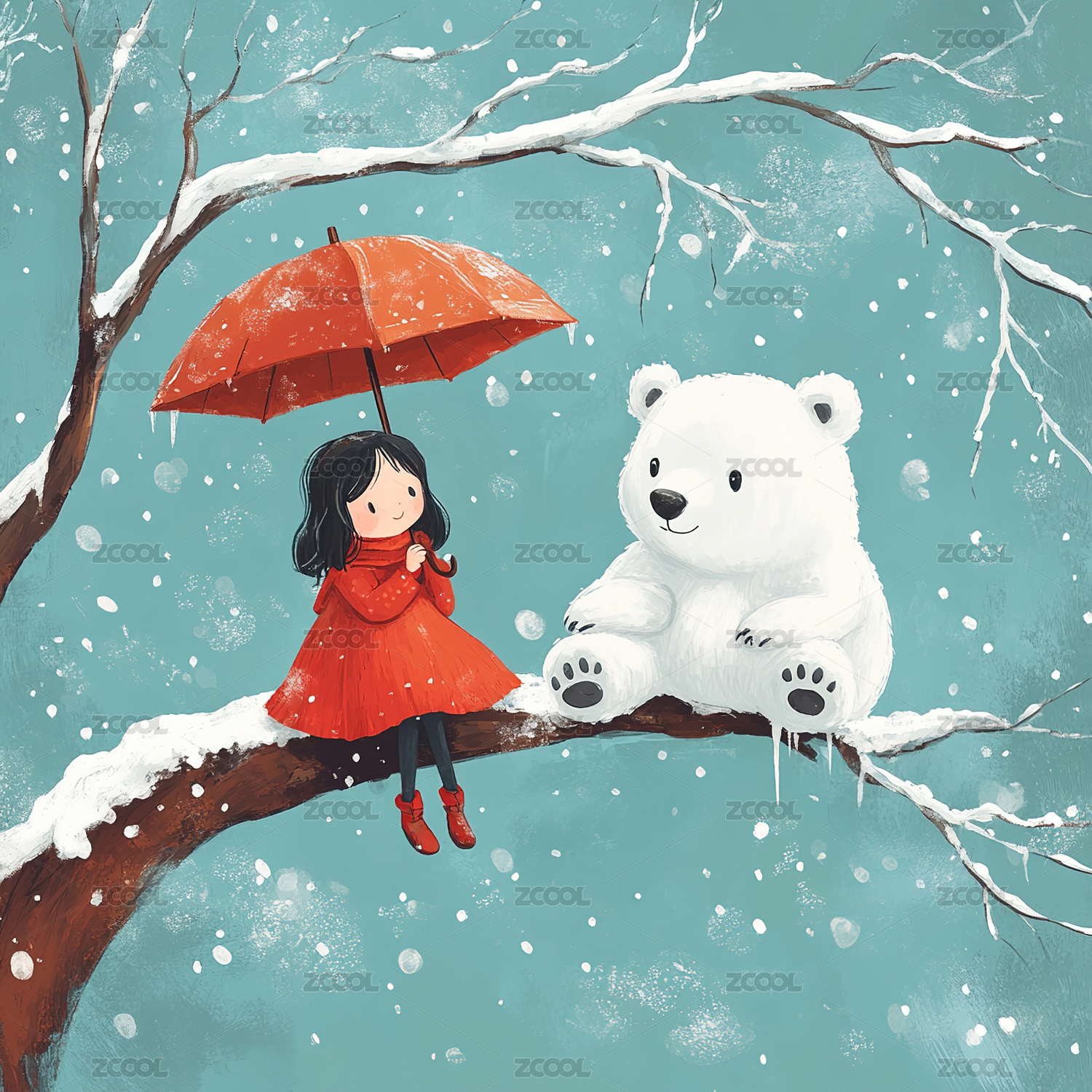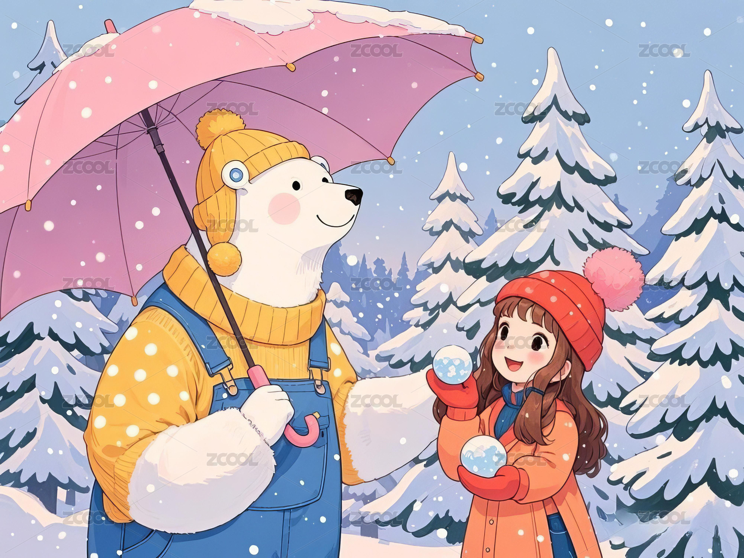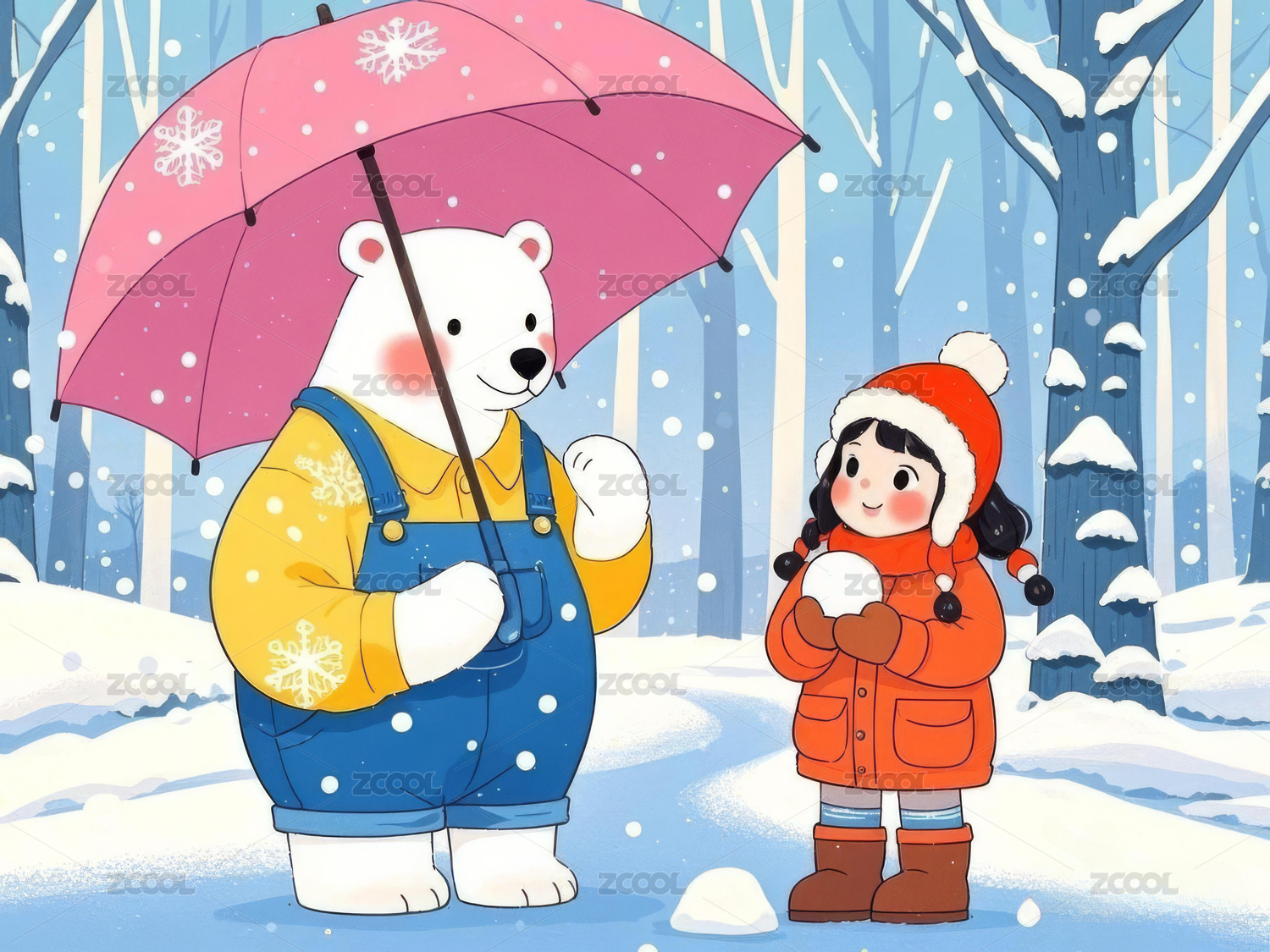 冬季里拿着雨伞的大白熊和小女孩