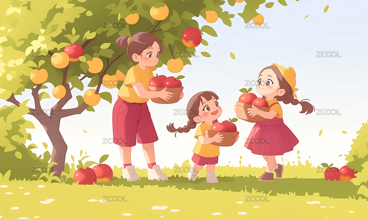 秋季亲子采摘插画