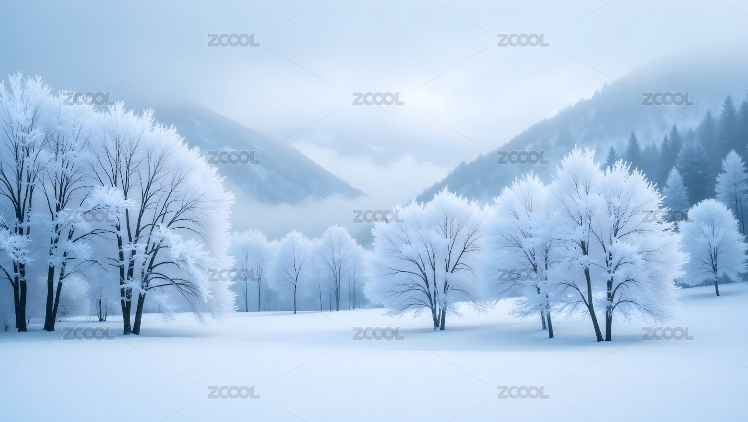 冬日雪景中的树木与远山