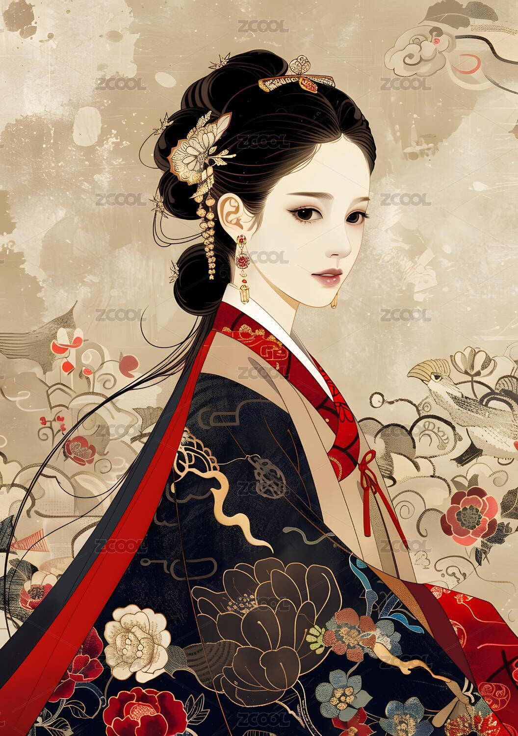 美丽的古装汉服女孩插画