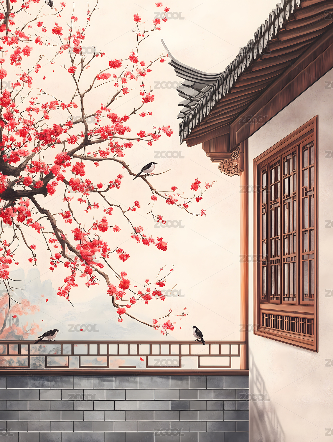 水墨写意红梅与古建筑