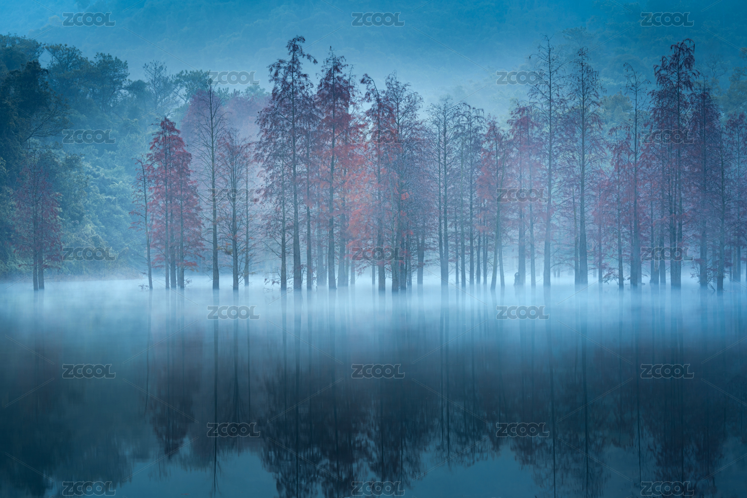 中国浙江台州黄岩长潭湖湖面的红水杉