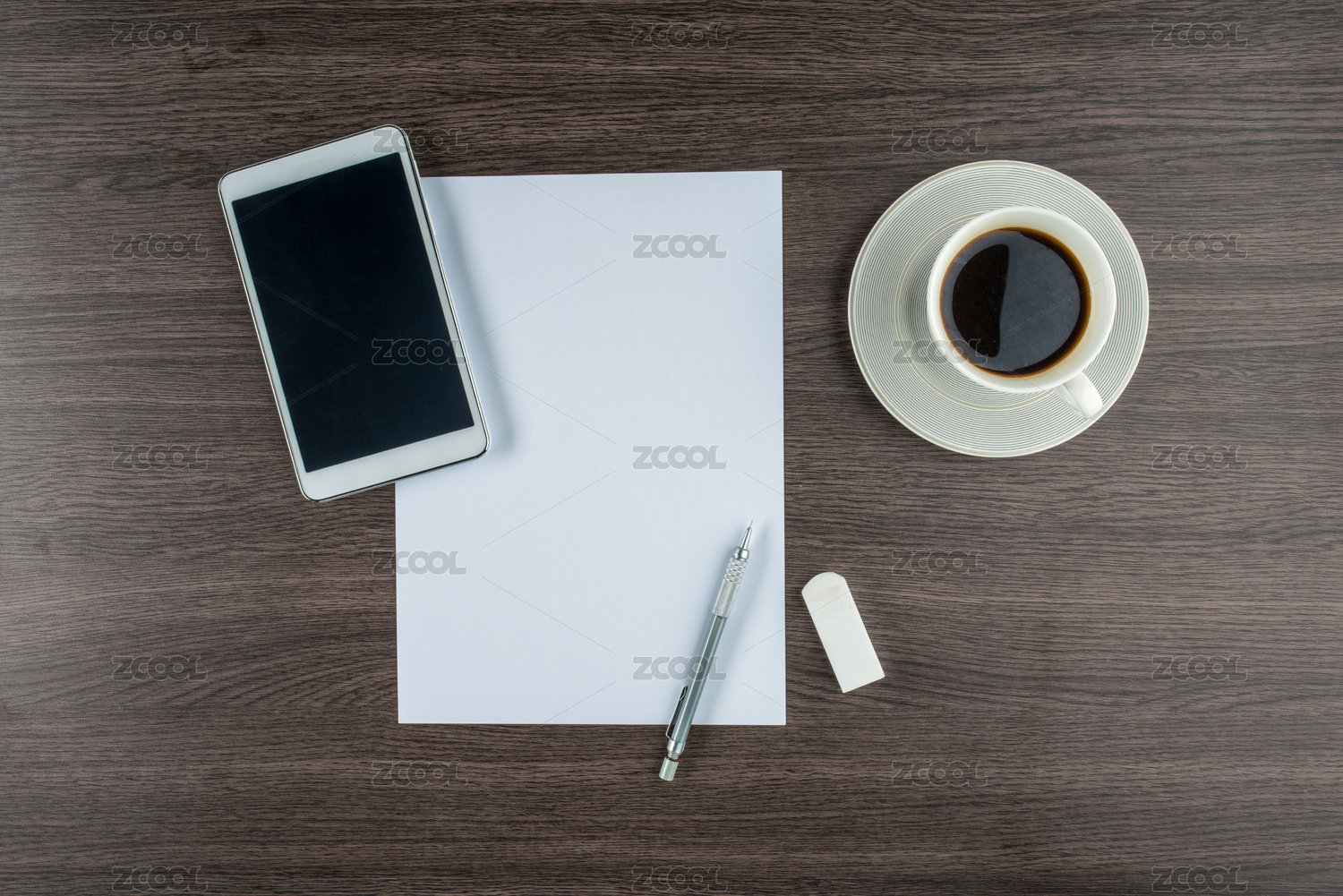 平板电脑,纸,橡皮和铅笔机械与一杯咖啡
