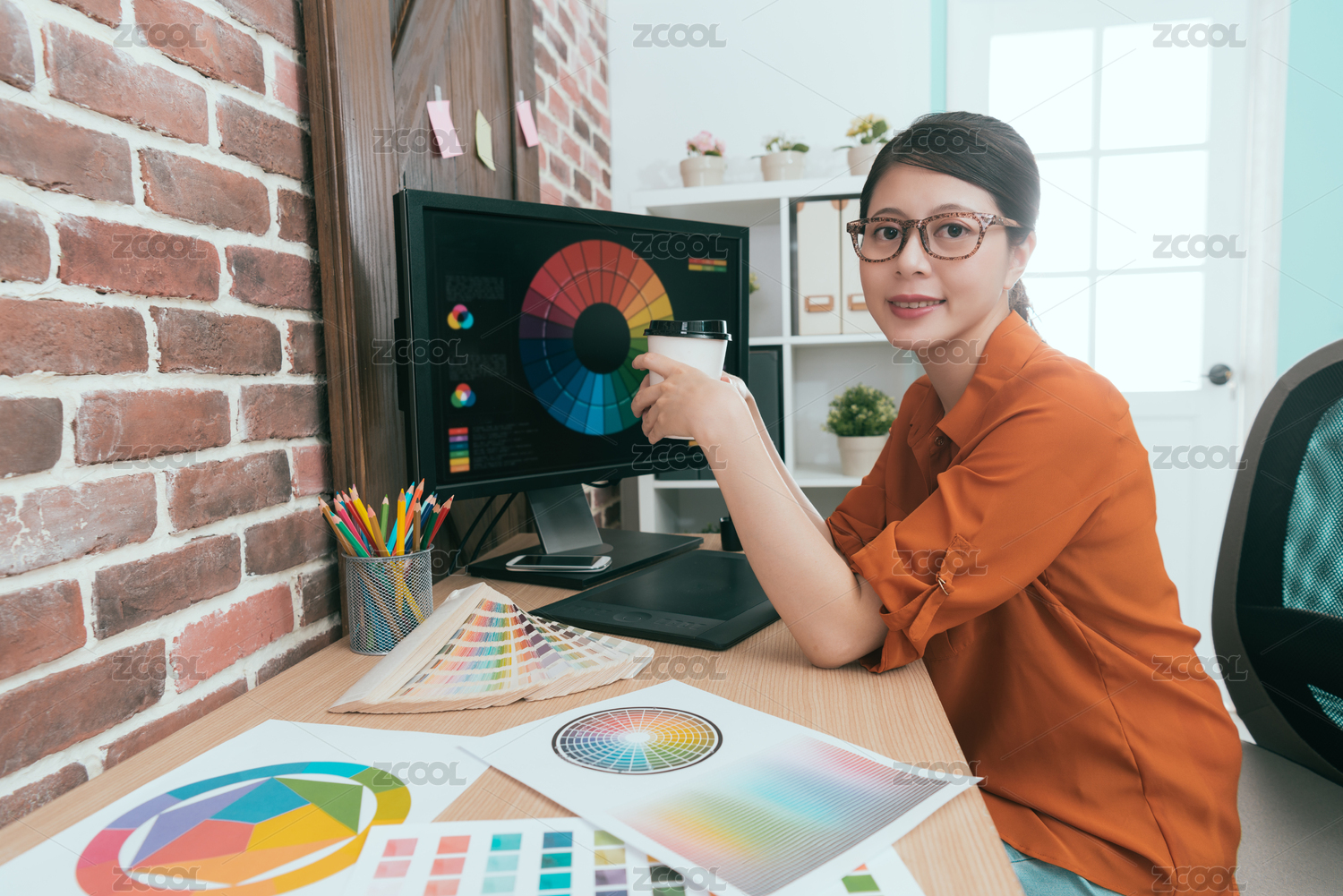 漂亮优雅的女性设计师拿着调色板工具寻找新产品的灵感,并在办公室坐在电脑设计的面前。