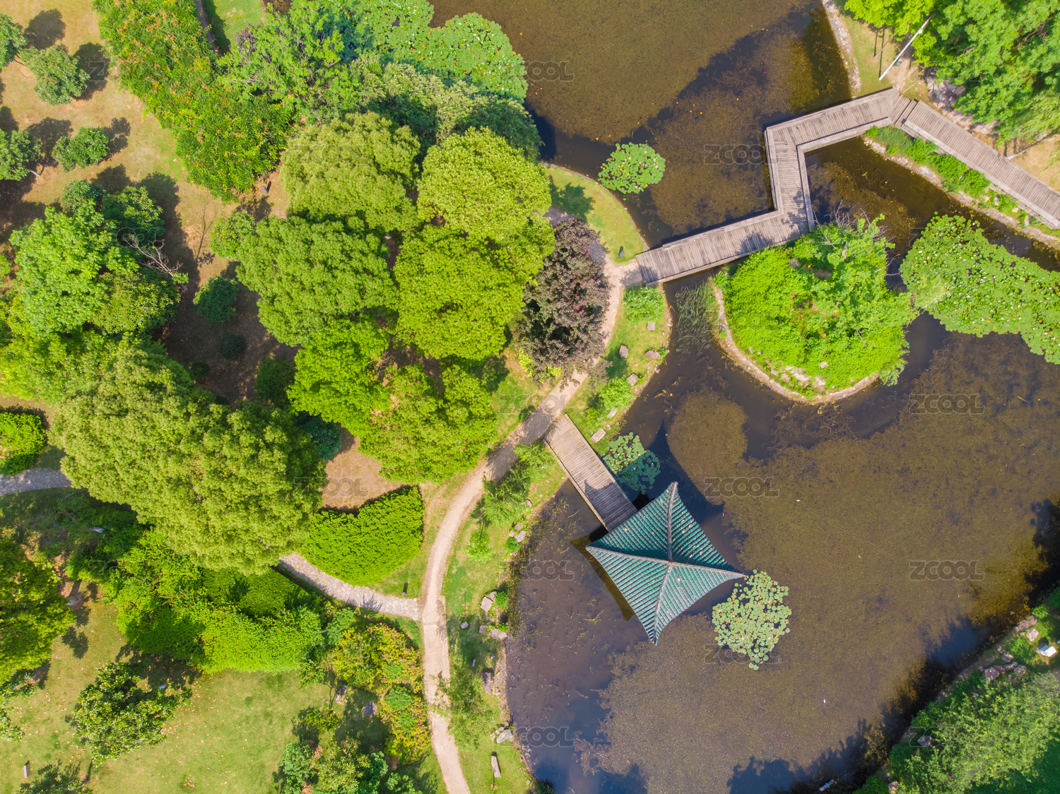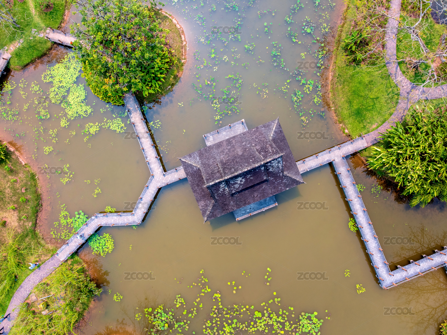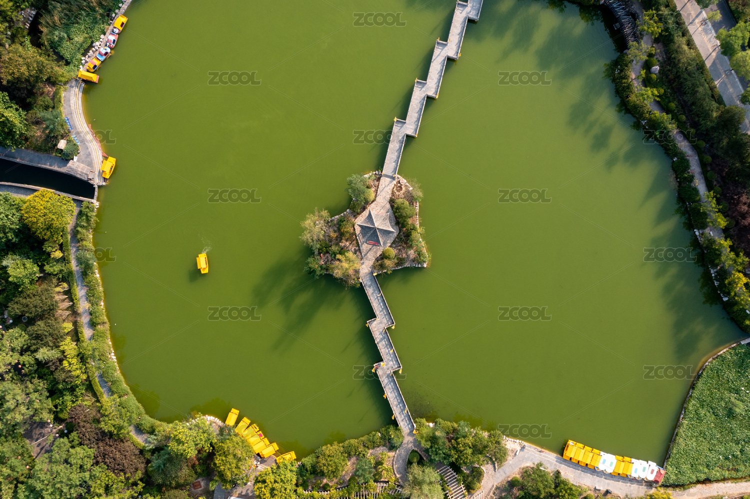 航拍云南昆明翠湖公园九曲桥景观湖泊石桥