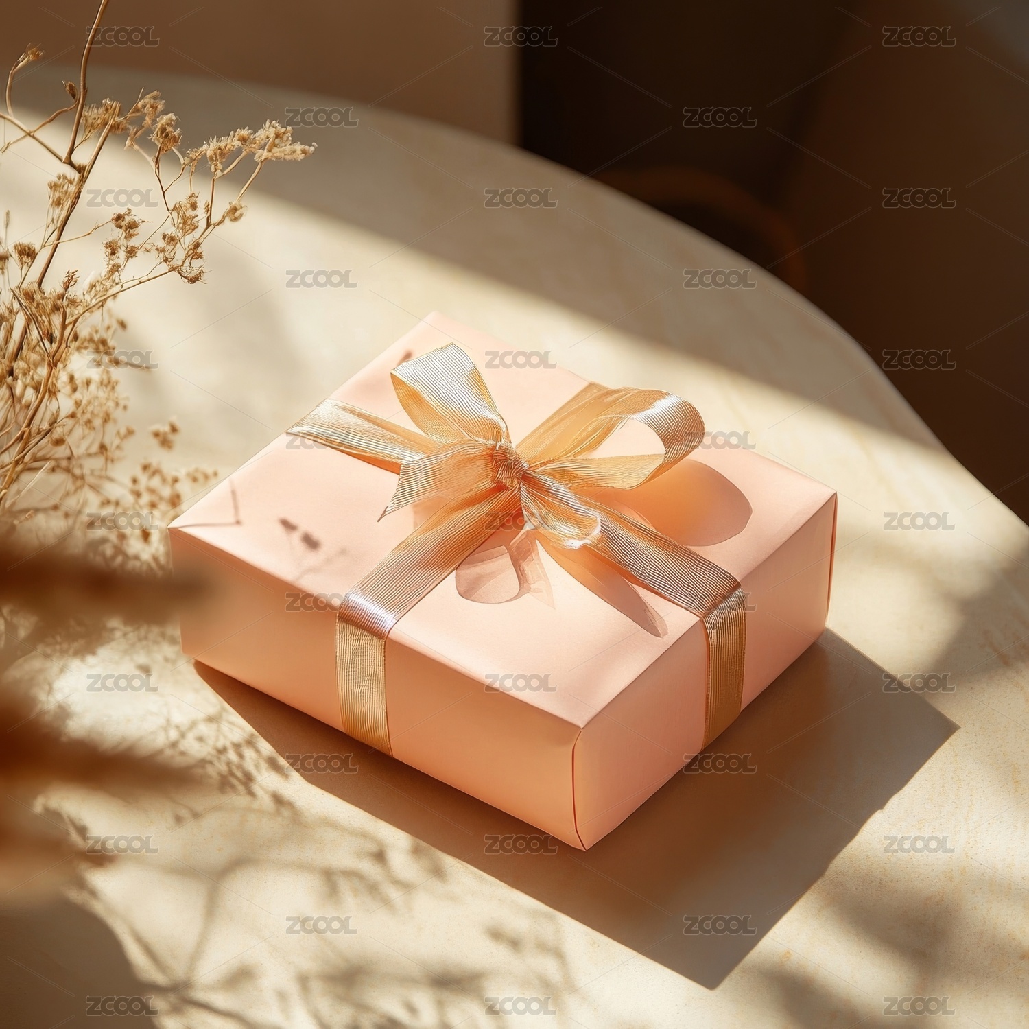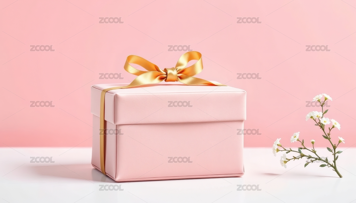 粉色礼盒配金色蝴蝶结与白花