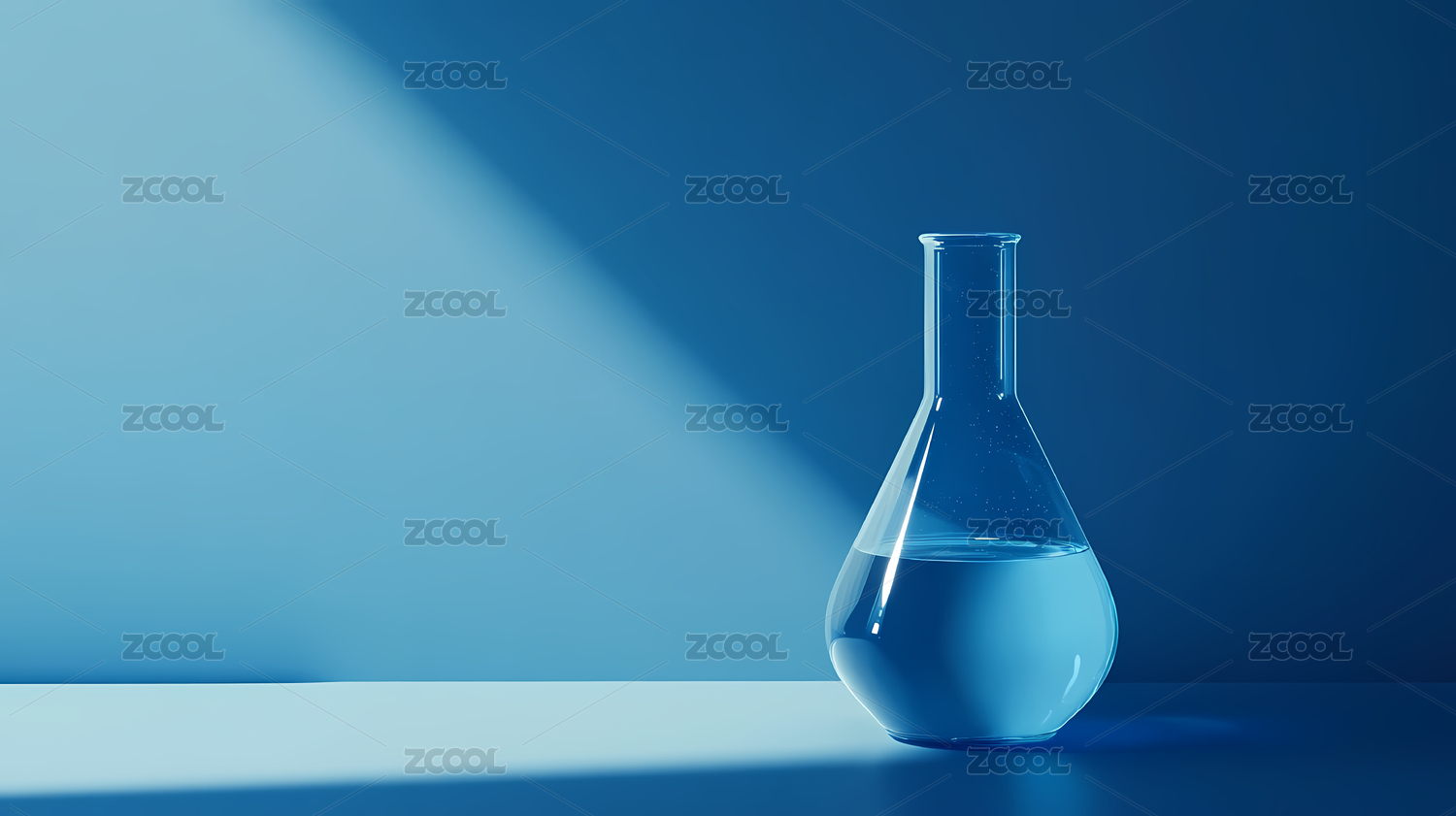 蓝色液体的锥形瓶置于明亮背景前