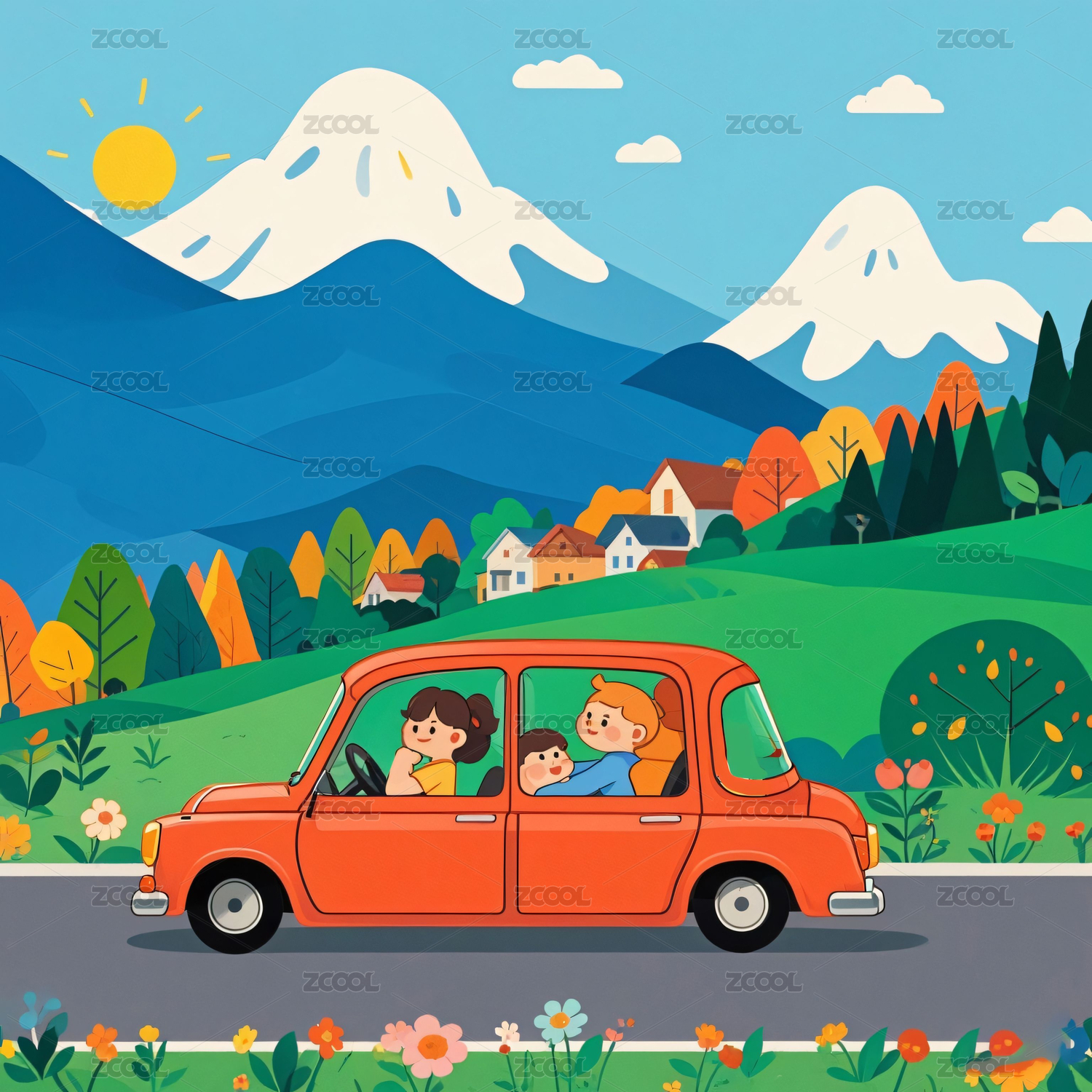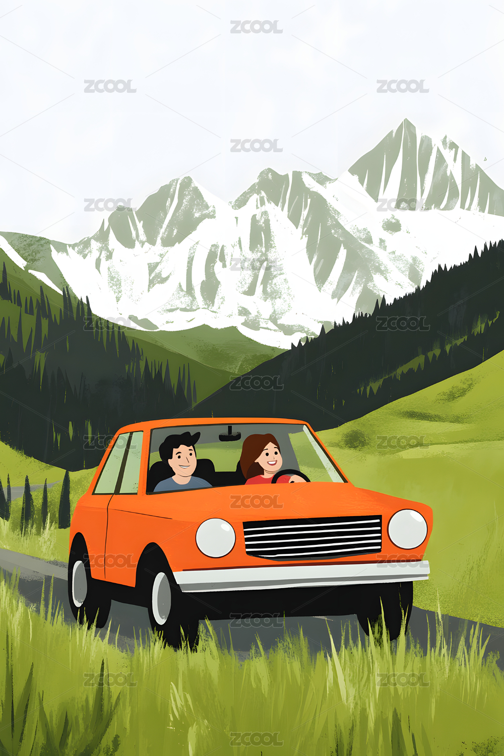 AIGC202404,旅行,插画,风景,风光,开车,自驾,旅游
