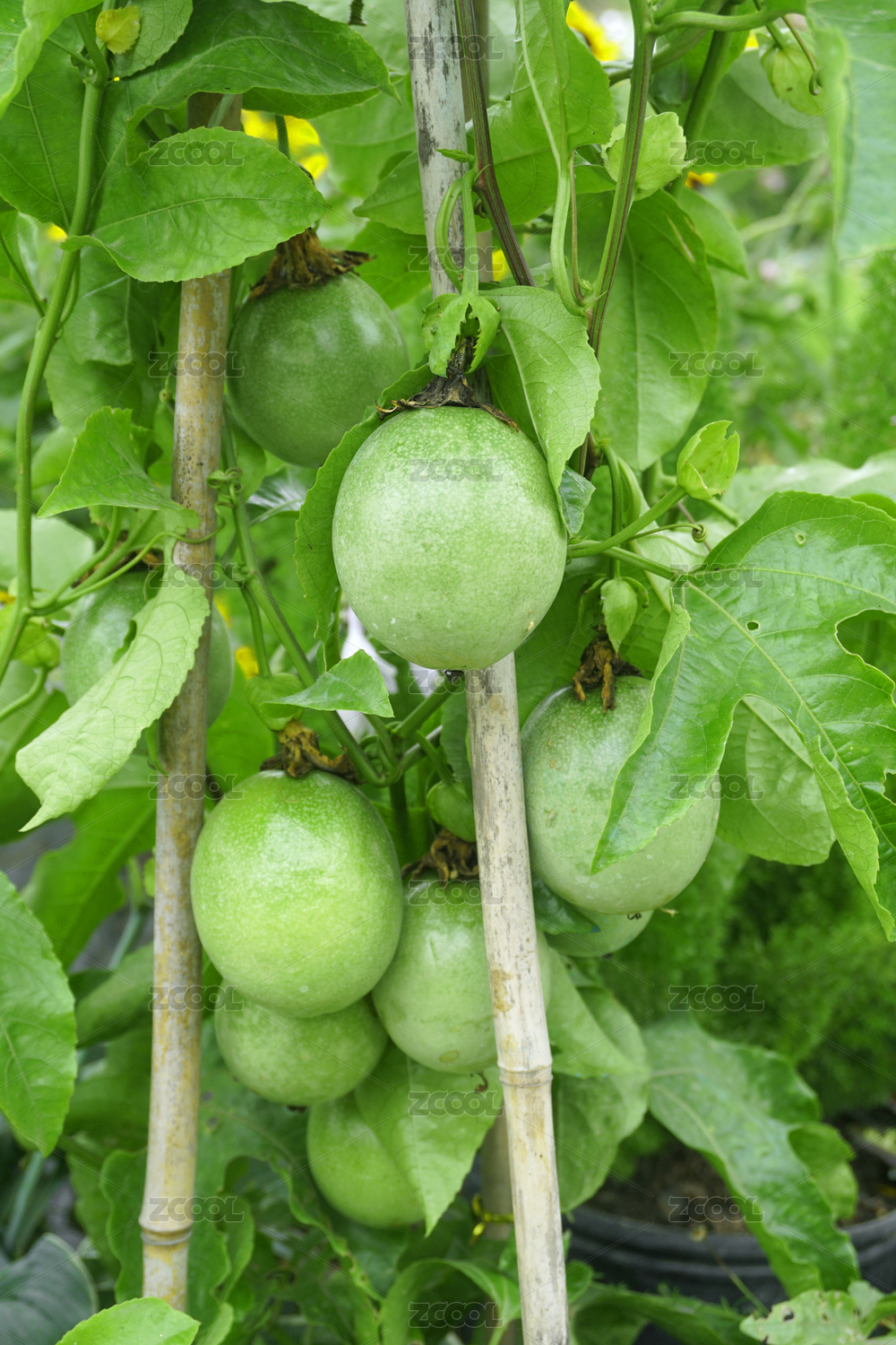 夏天的果园里果实饱满翠绿的百香果与百香果