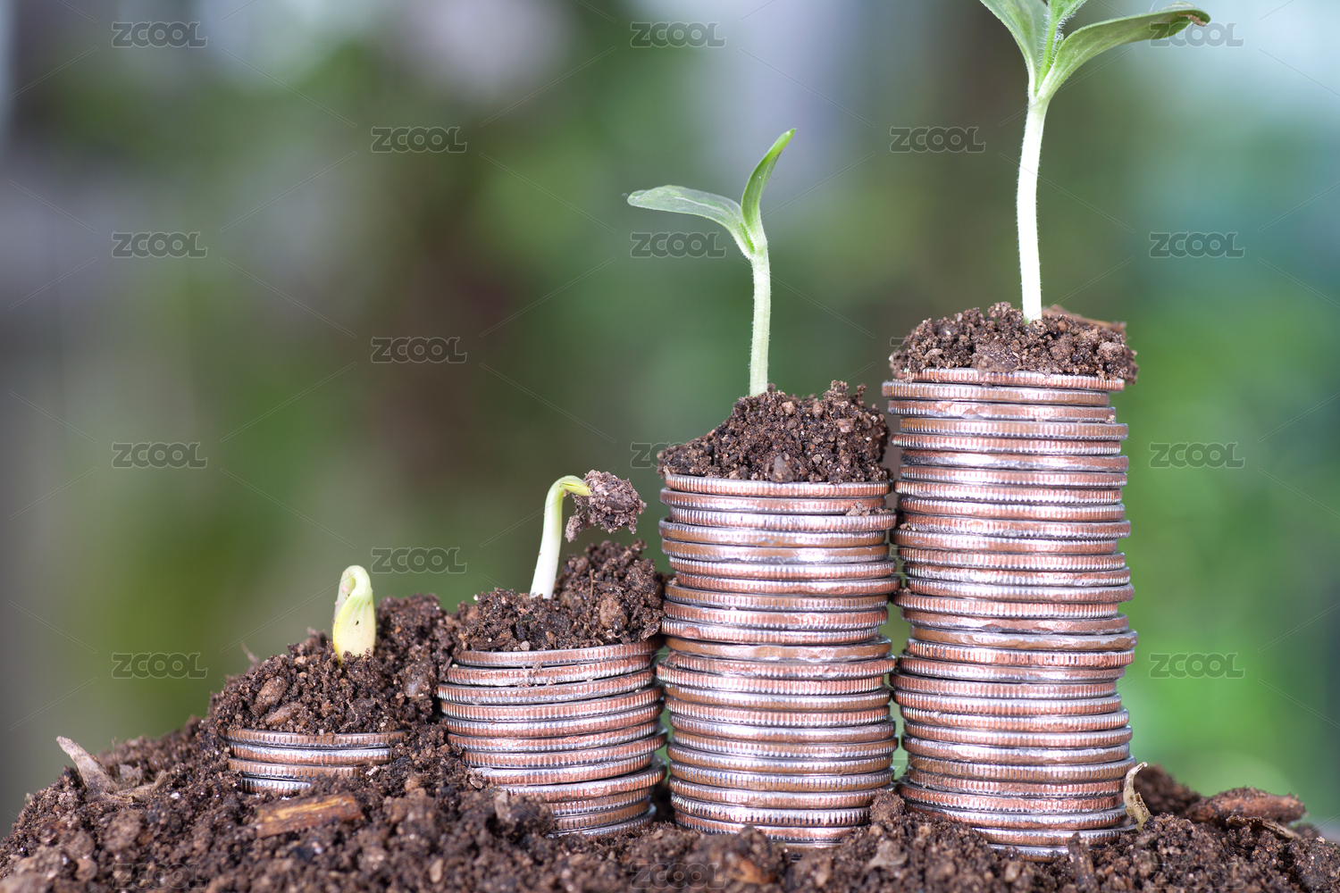 土壤里冒出一堆递增的美元硬币且硬币上都长出嫩芽