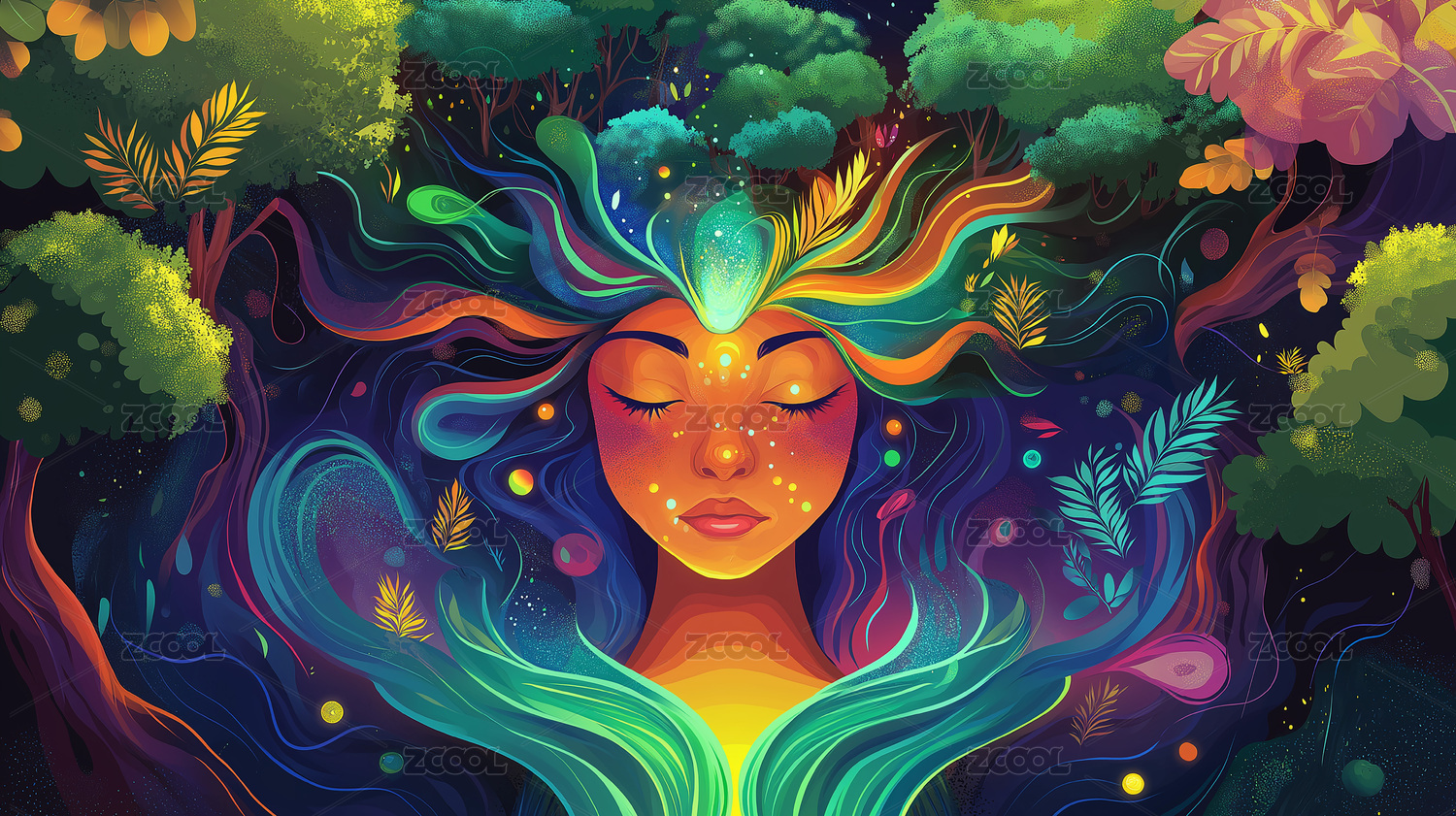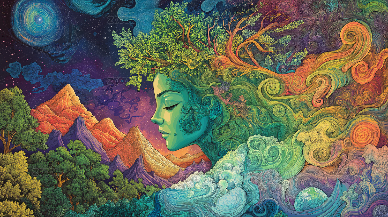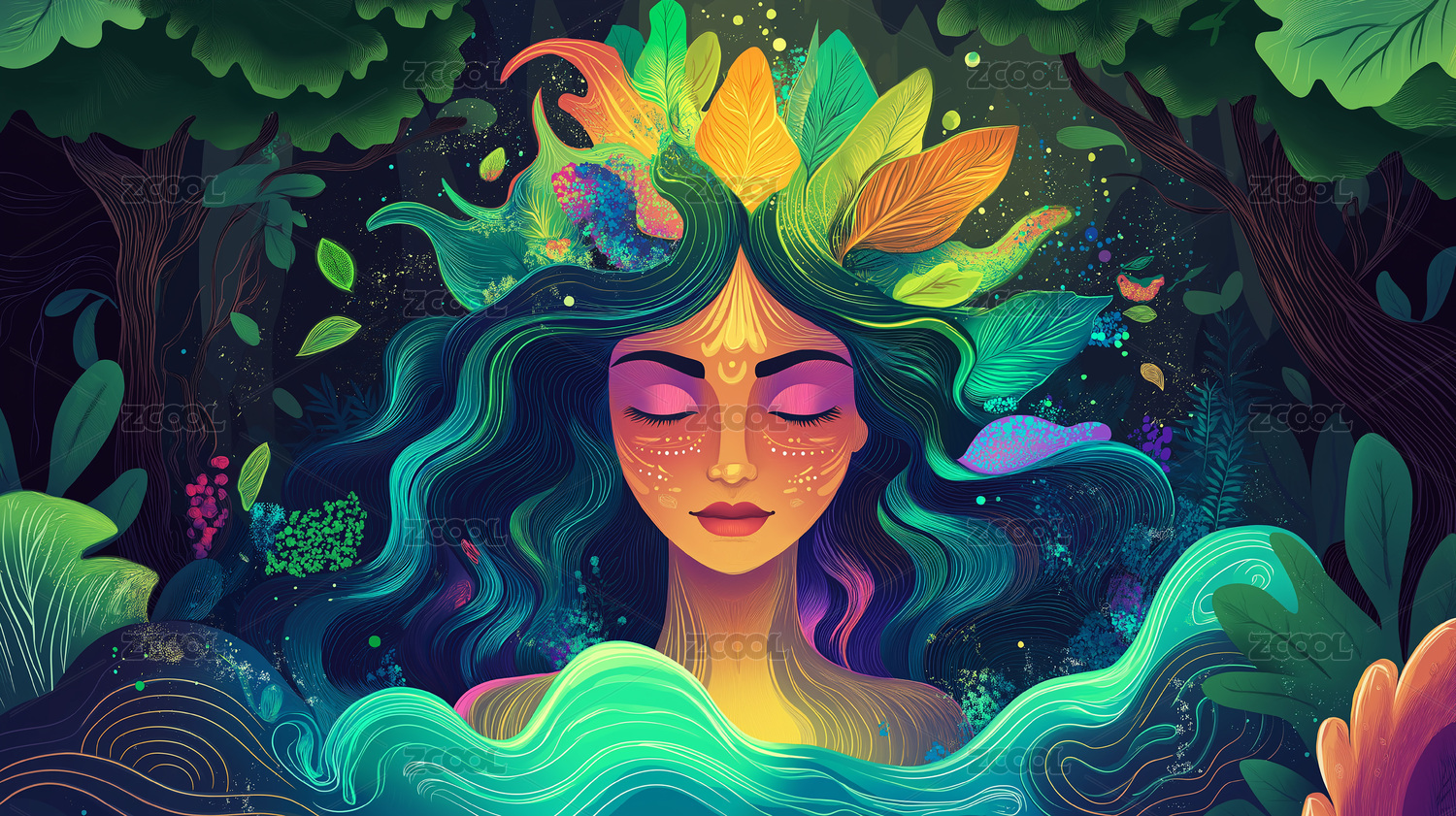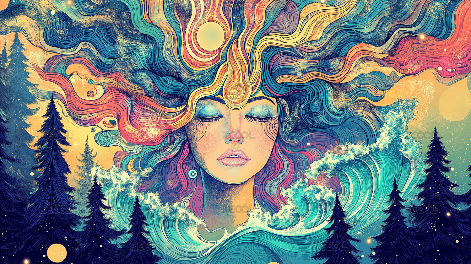梦幻,色彩,女性,侧脸,海浪,森林,抽象,艺术,情感,表达
