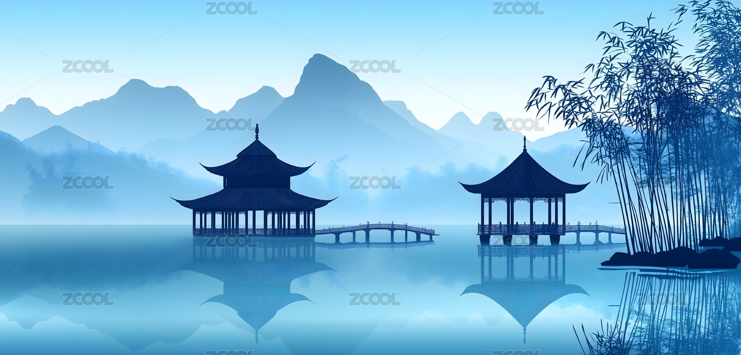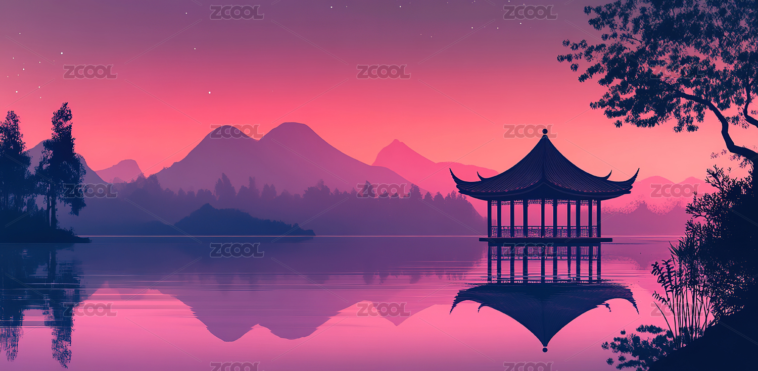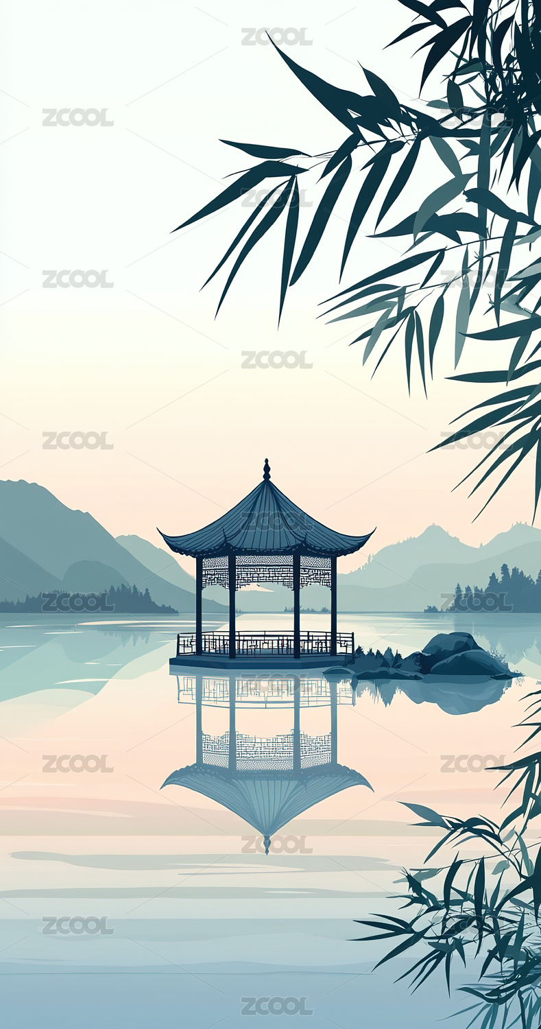插画,背景,中式,国潮,国风,风景,建筑,亭子,云,水