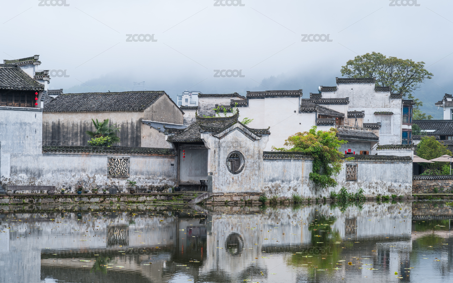 雨雾中的安徽省黄山市徽州区呈坎古镇景观