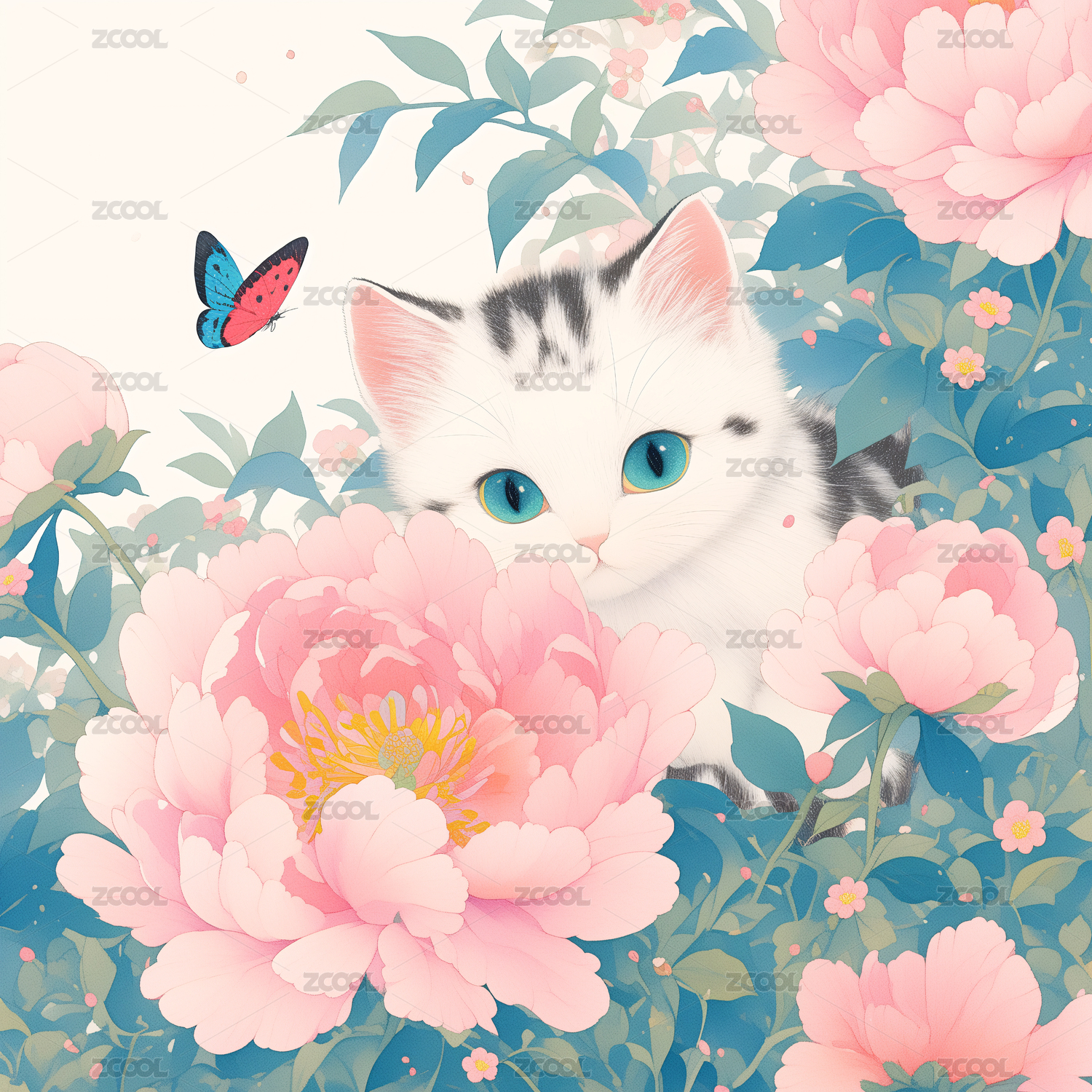 可爱猫咪在牡丹花丛中蝴蝶谷雨节气插画