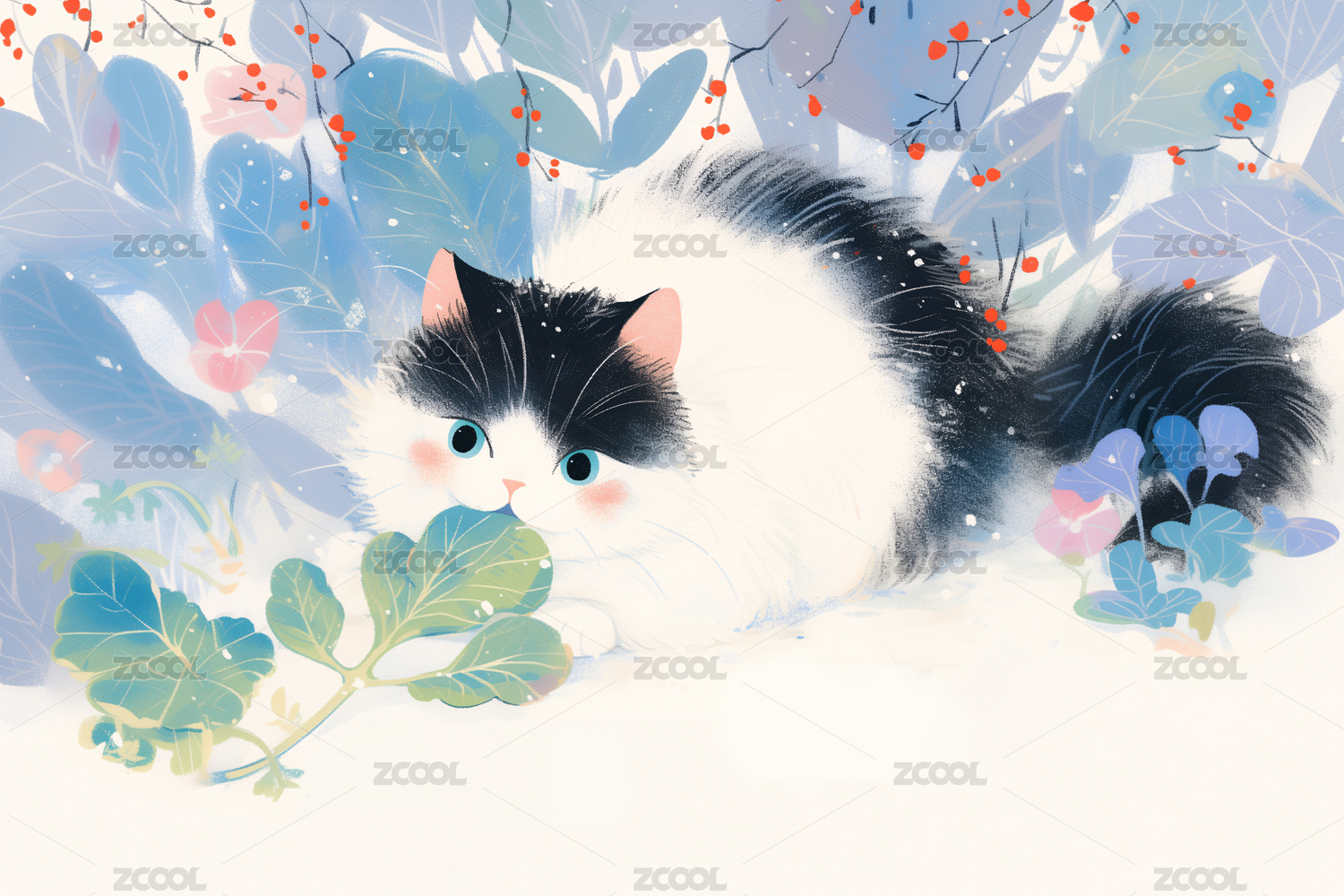 可爱猫咪在嗅菜叶玩耍宠物治愈插画