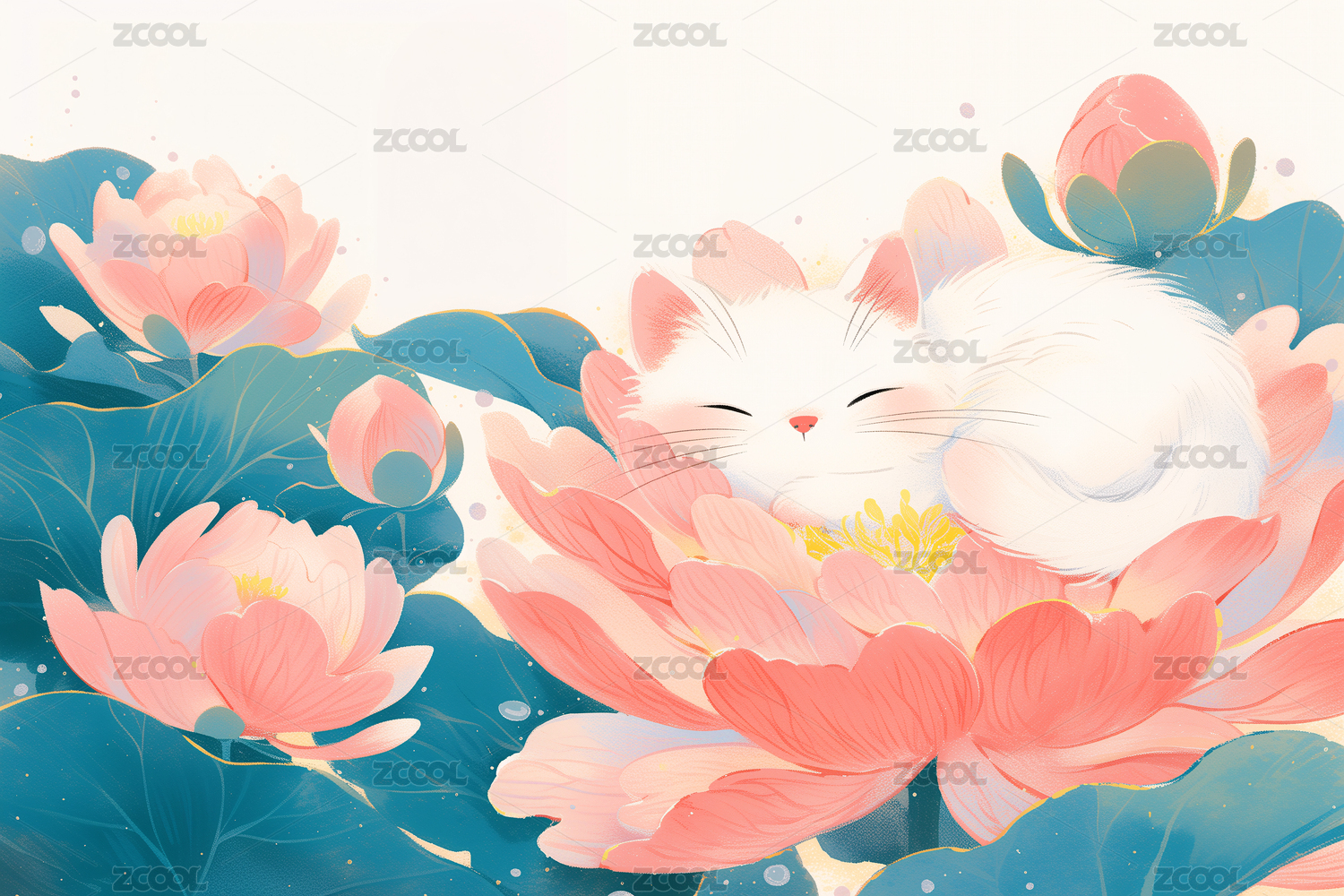 可爱的白猫趴在牡丹花上睡觉谷雨节气插画