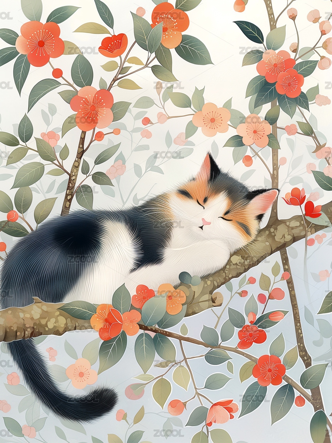 可爱猫咪趴在牡丹花上睡觉治愈梦幻插画