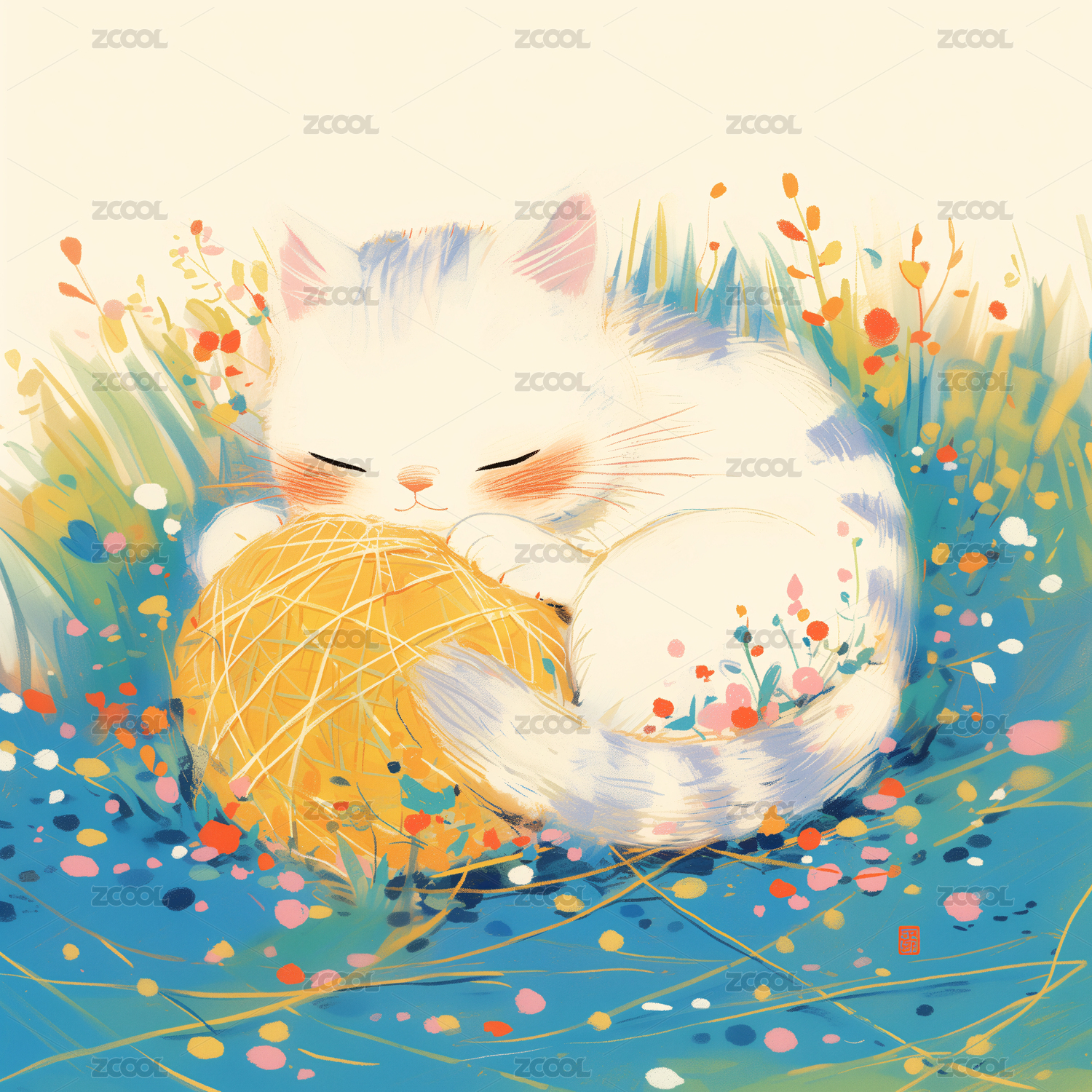 可爱猫咪抱着毛线团花草丛春天治愈插画