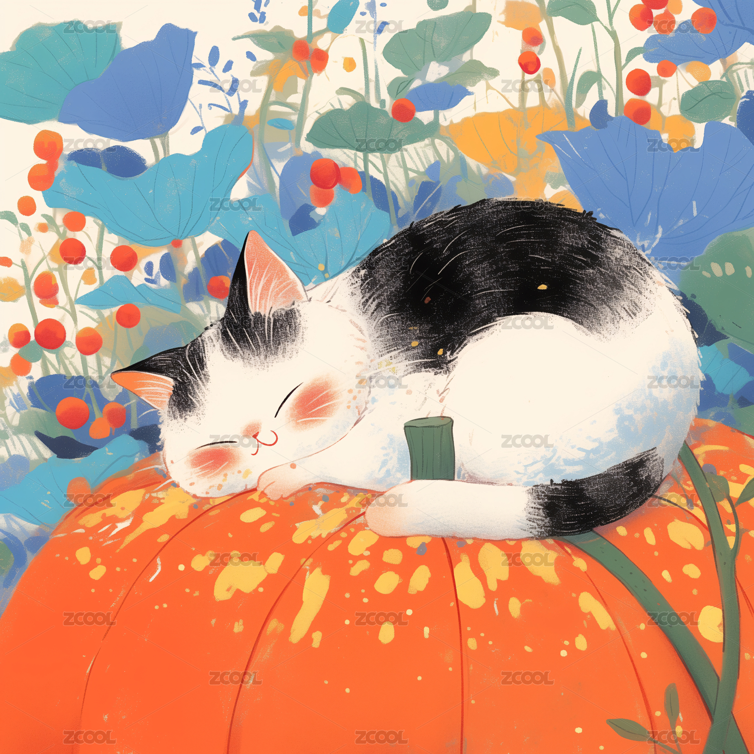 可爱猫咪趴在南瓜上睡觉秋季插画