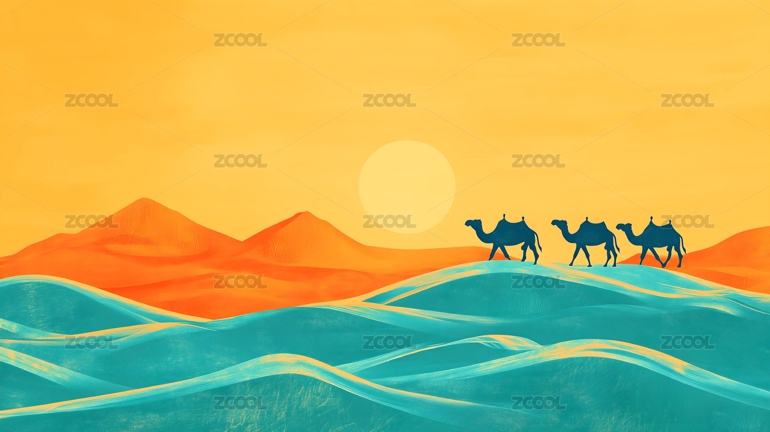 金色沙漠 青绿色山丘和骆驼队 丝绸之路