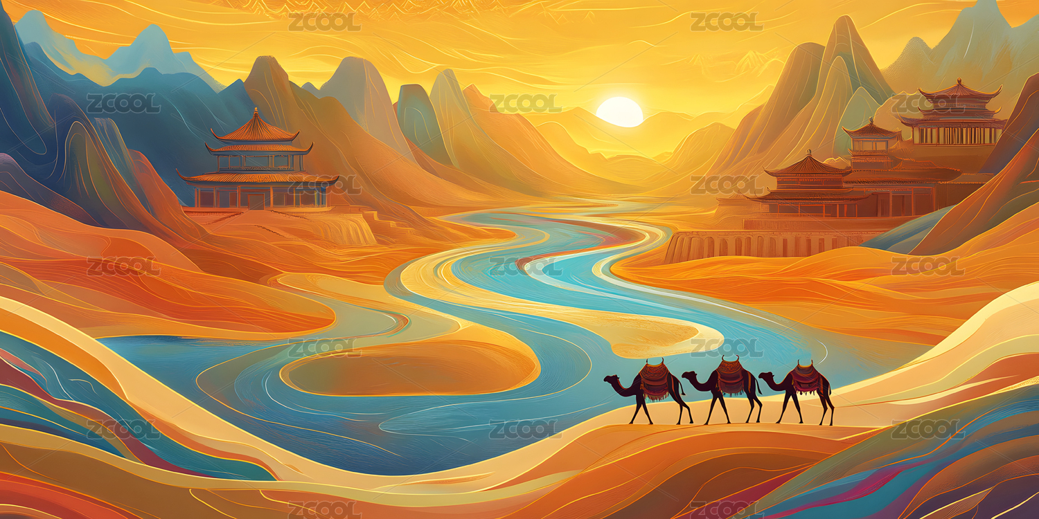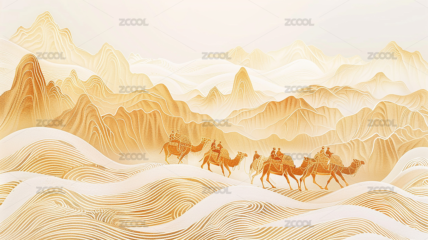 金色沙漠和行走的骆驼队,丝绸之路插画