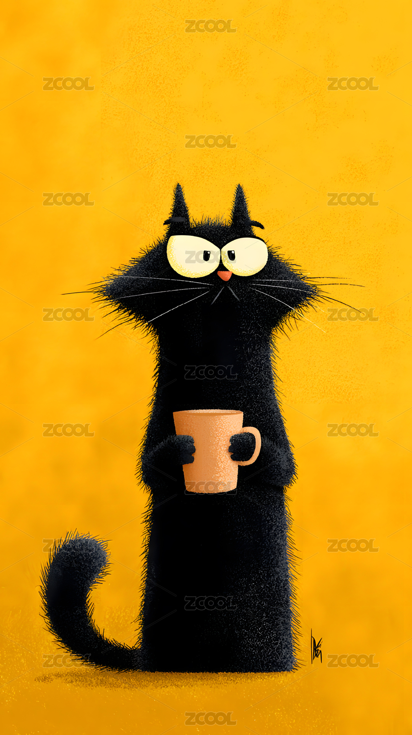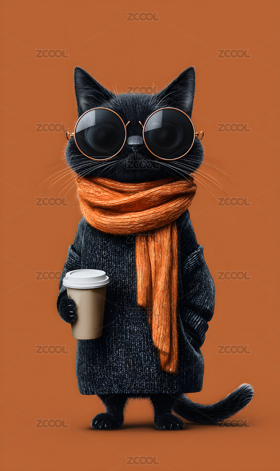 一只戴着墨镜和围巾的黑猫拿着咖啡杯