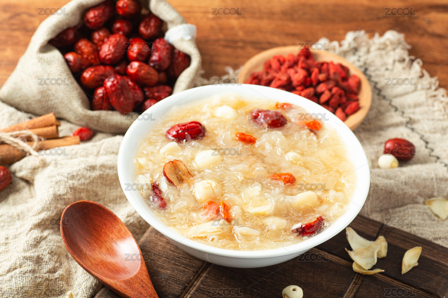 复古木纹桌子上的红枣银耳莲子羹