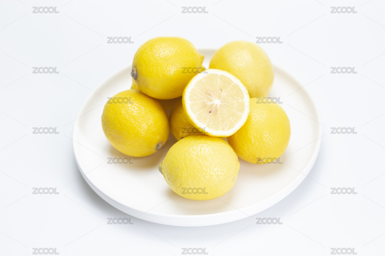 白底上放着一盘新鲜黄柠檬和切片柠檬