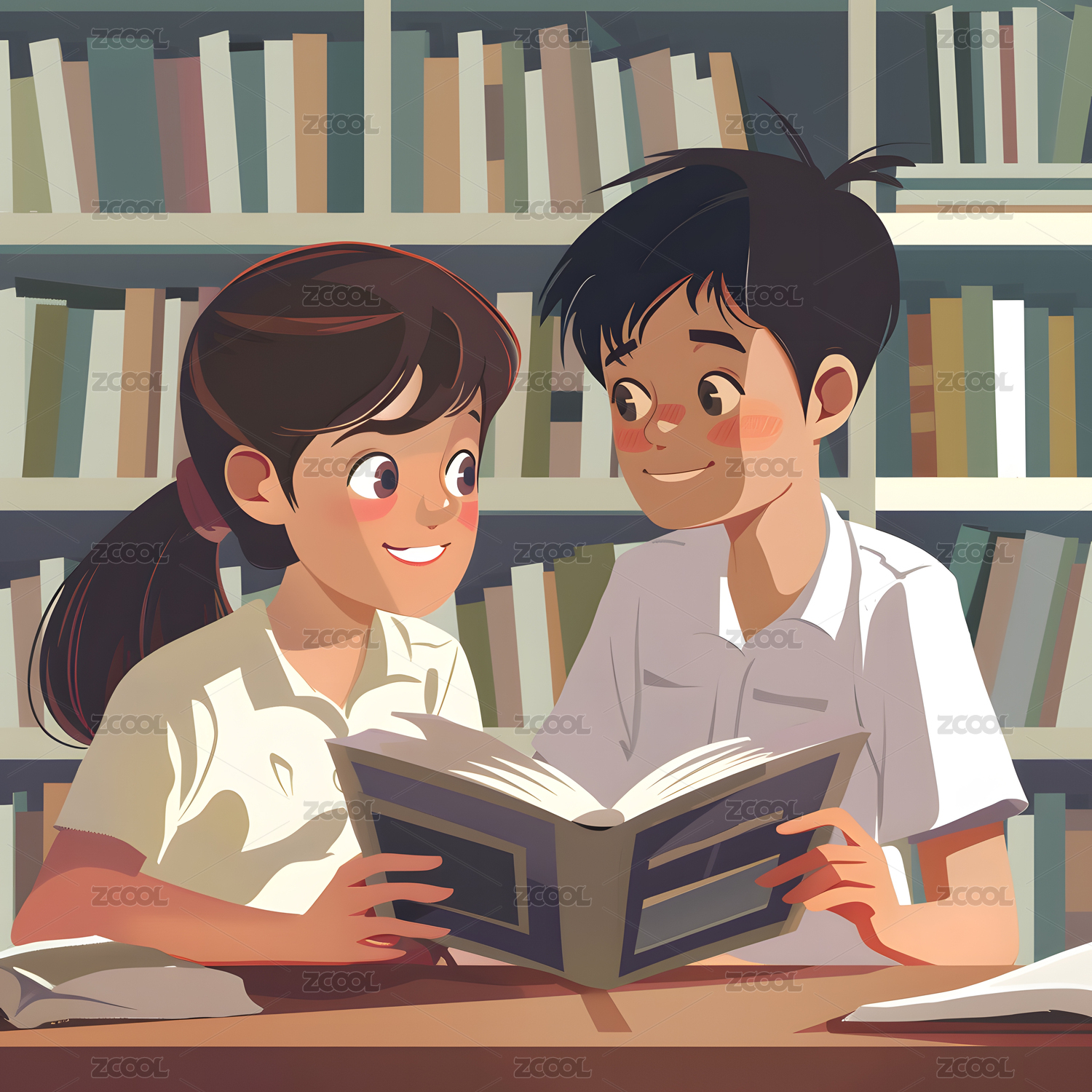 一个男同学和一个女同学在图书馆里读书