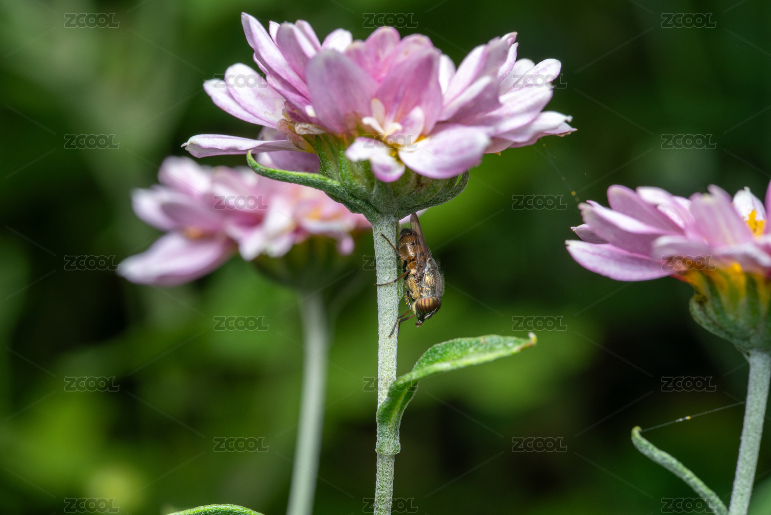 紫红色百日菊上的蜂蝇