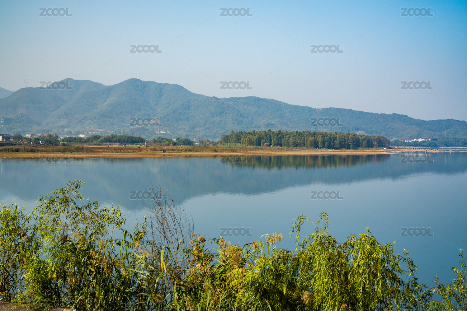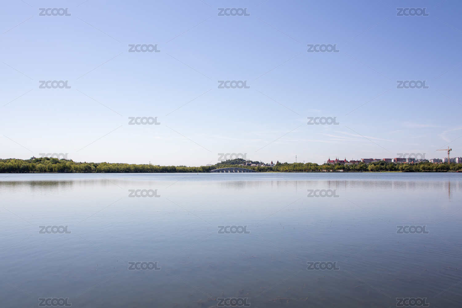 中国浙江金华义乌植物园蓝天下的湖畔风光