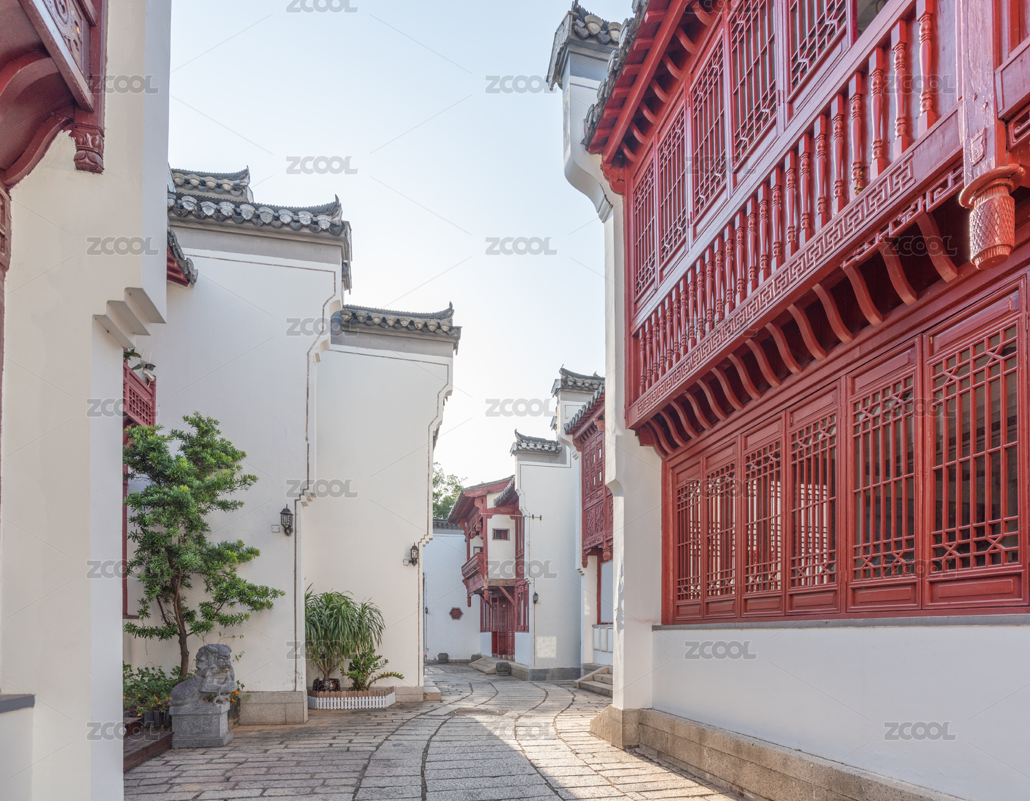 低角度拍摄白墙灰瓦民居和铺路石地面