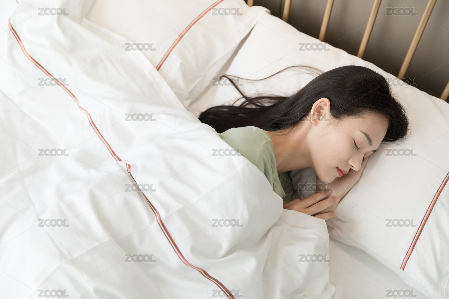 年轻女性躺在床上枕着枕头侧身睡觉俯拍